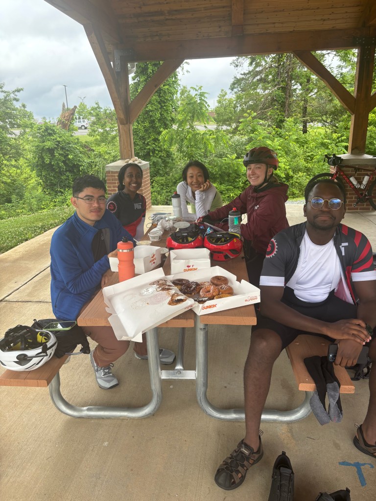 Once we were all assembled at the bottom of the mountain, we ate some brunch, pumped up our tires, and got on the road. Although Greg and my dad were purportedly here to ride “with Spokes”, I guess the beautiful Virginia hills got to them because they took off as soon as we started. I let them get away the first couple miles, until I decided I couldn’t let two middle-aged dudes get the better of Greta Lawler so I showed them what I was made of (aka drafted off my Dad for the rest of the ride) 👍 Besides their super speedy bike skills, I was super happy to have Greg and my Dad with us for a day! Greg taught us to think about our energy reserves as a matchbox; each one of us has only a limited number of matches to burn each day. Its important to know how many you have and to decide carefully how to use them. I really liked that one! My dad updated his advice to future Spokes from “be safe and have fun” to “be prepared for rain.”