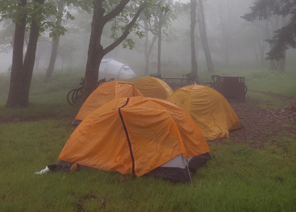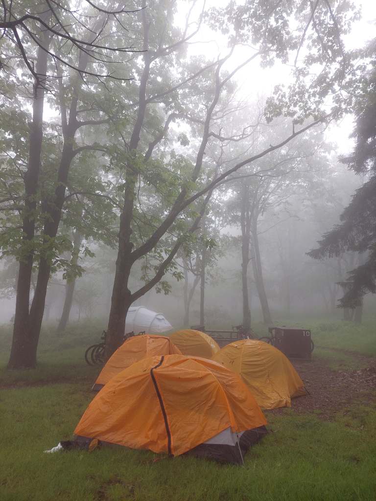 “There’s no way I’m biking down Skyline Drive this morning,” I told Ruth as the pitter patter of rain woke us up from our short, wet night of sleep. Yesterday, we completed the long ascent up Skyline Drive and I had spent hours of it imagining us all flying down the mountain at the end. Unfortunately, the combination of blind curves, thick fog, and heavy rain was a perfect recipe for broken bikes and broken Spokies–not a desired outcome on day 4 (or day anything) of our trip.