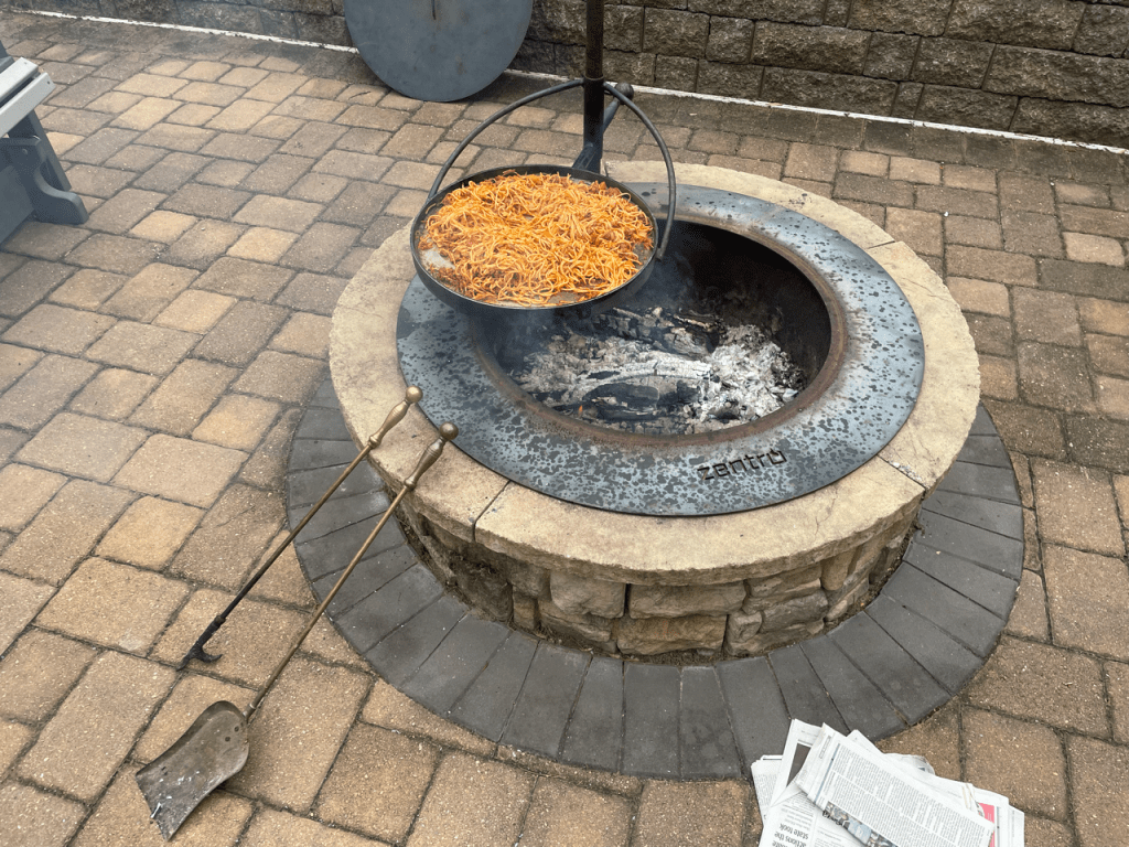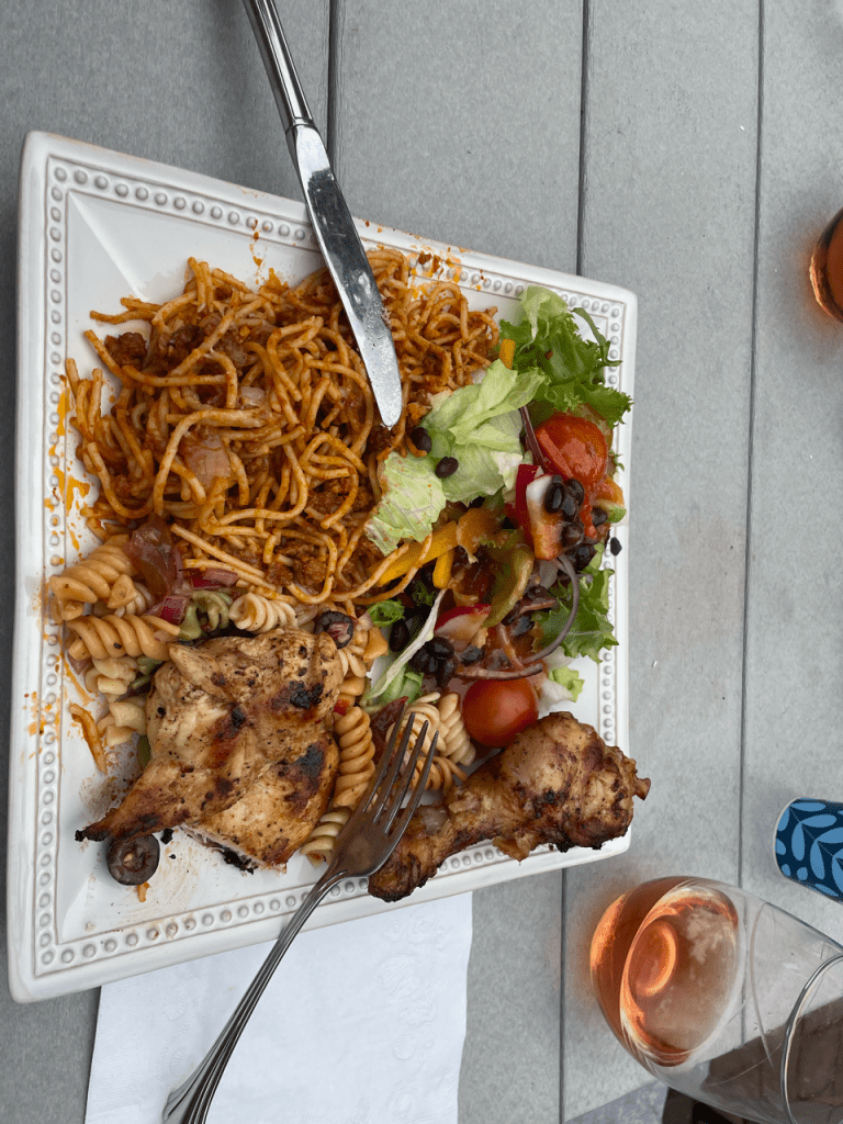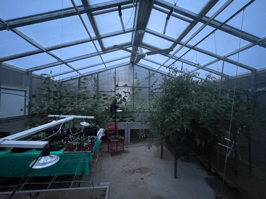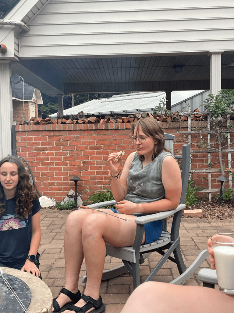 Eventually the shame set in and we called it quits on that. We all made it to the house for the night and met our lovely hosts, Sharon and Keith. They cooked us an immaculate dinner and gave us a tour of their greenhouse that Keith built during COVID. S’mores followed dinner (Ramona had her first ever smore, as well as her second and third). Our long-awaited attempt at a movie night was postponed yet another night as people cozily chatted and blogged by the fire.