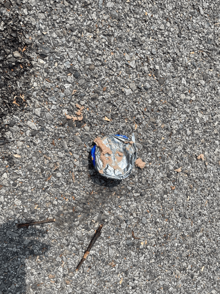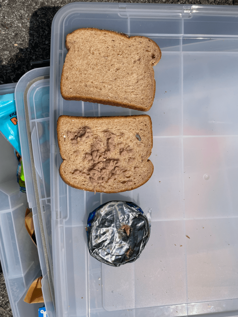 The third and final rest stop of the day was when most people decided to eat their lunch. I hadn’t fixed myself a lunch in the morning, so I tried to make myself a very simple tuna sandwich. There was one problem, though. The can opener was in the cooking supplies box that was under another box in the trunk. I was also feeling very lazy. Greta definitely egged me on by suggesting that it was possible to open the can by smashing it on the ground.