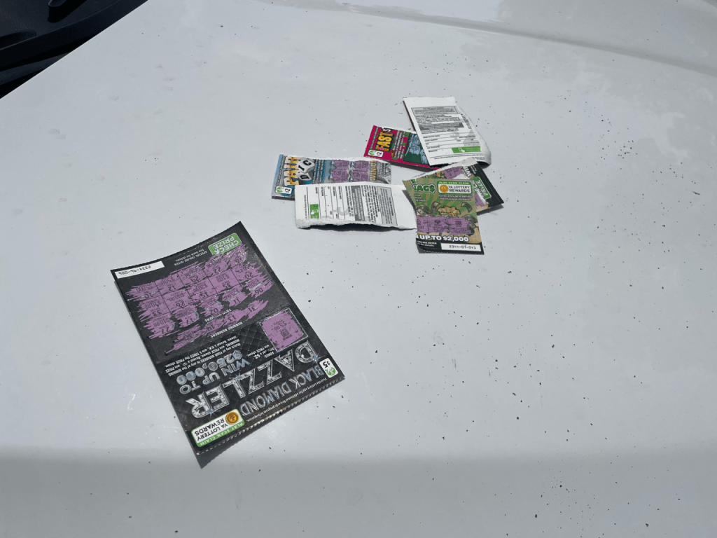 We did not win a single scratch-off. However, as the well-known statistic goes, 95% of gamblers quit before they win big. Big Spokes windfall coming next time for sure.