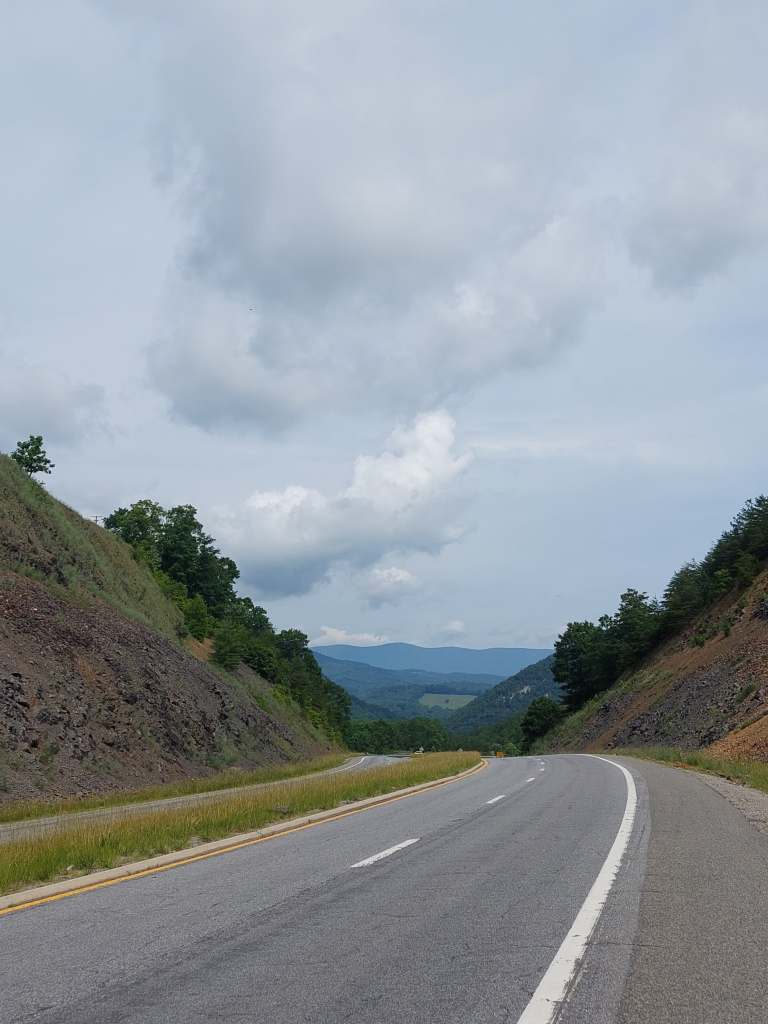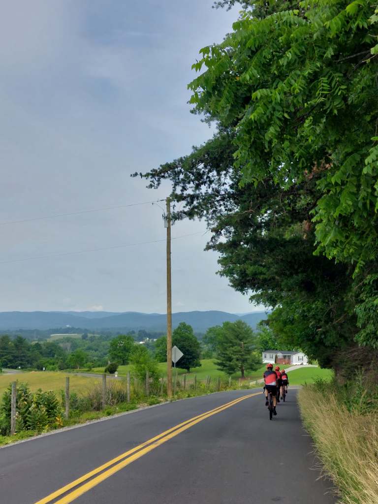 It’s Ramona again and welcome to day 9. The day started with some awesome power oatmeal that Sharon made for us. It had all kinds of amazing nutritious additions, so we we’re well equipped to start the day. I left Sharon’s and Keith’s home with some hesitation. We had had a great evening with smores and fire (read more (probably?) on Charles’ account on day 8), but I knew we had to hit the road. On paper, the day seemed chill enough – 68.2 miles and 4319ft of elevation (according to ridewithgps, our navigation devices thought it was more like 6000ft, but i think they are wrong). So we headed out from Radford! These were the views – some mountains in the background here and there, some trees, a little bit of ups and downs and cloudy skies.