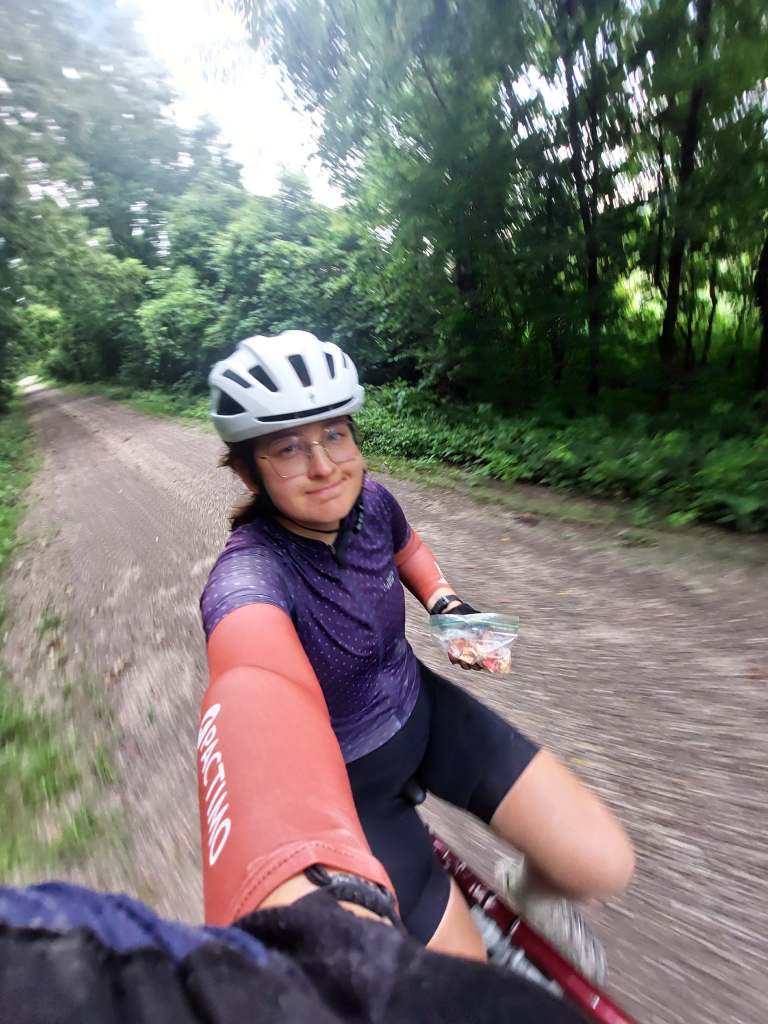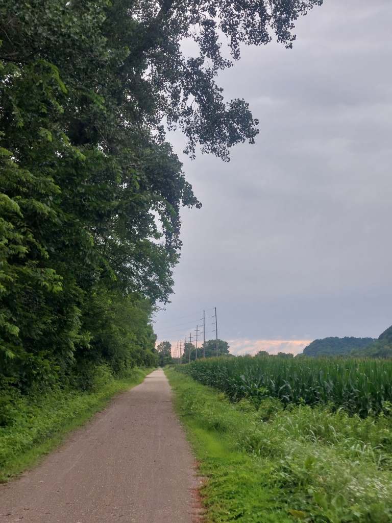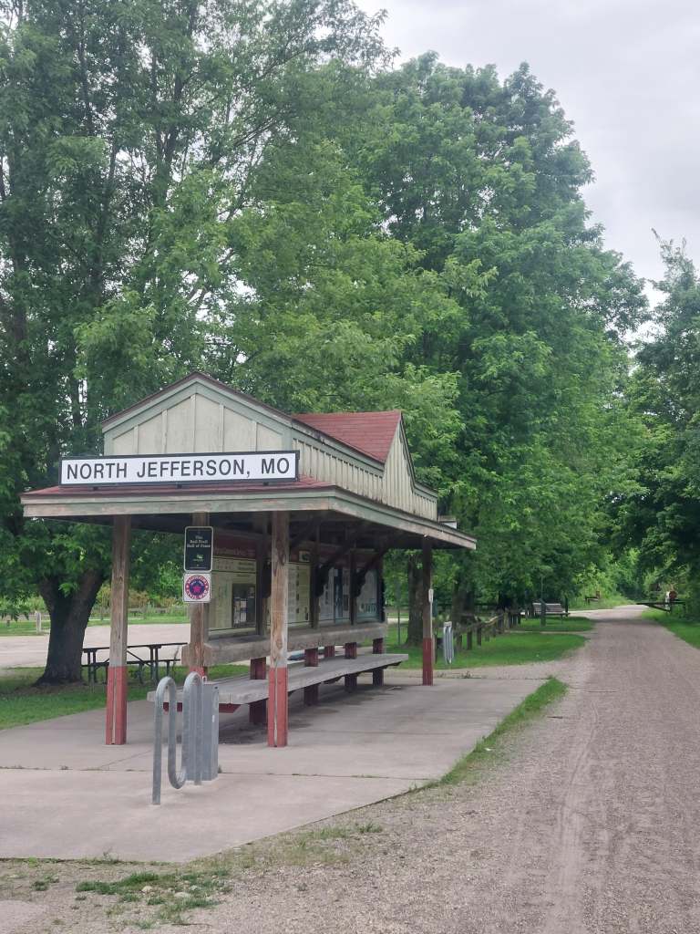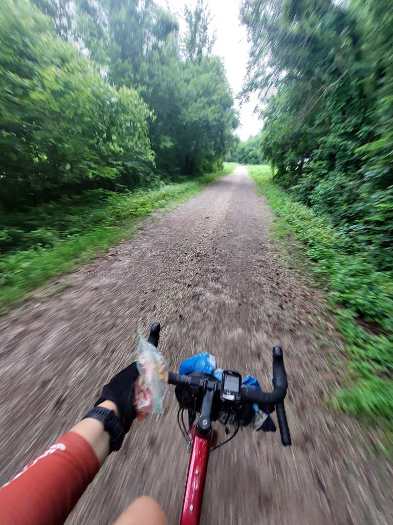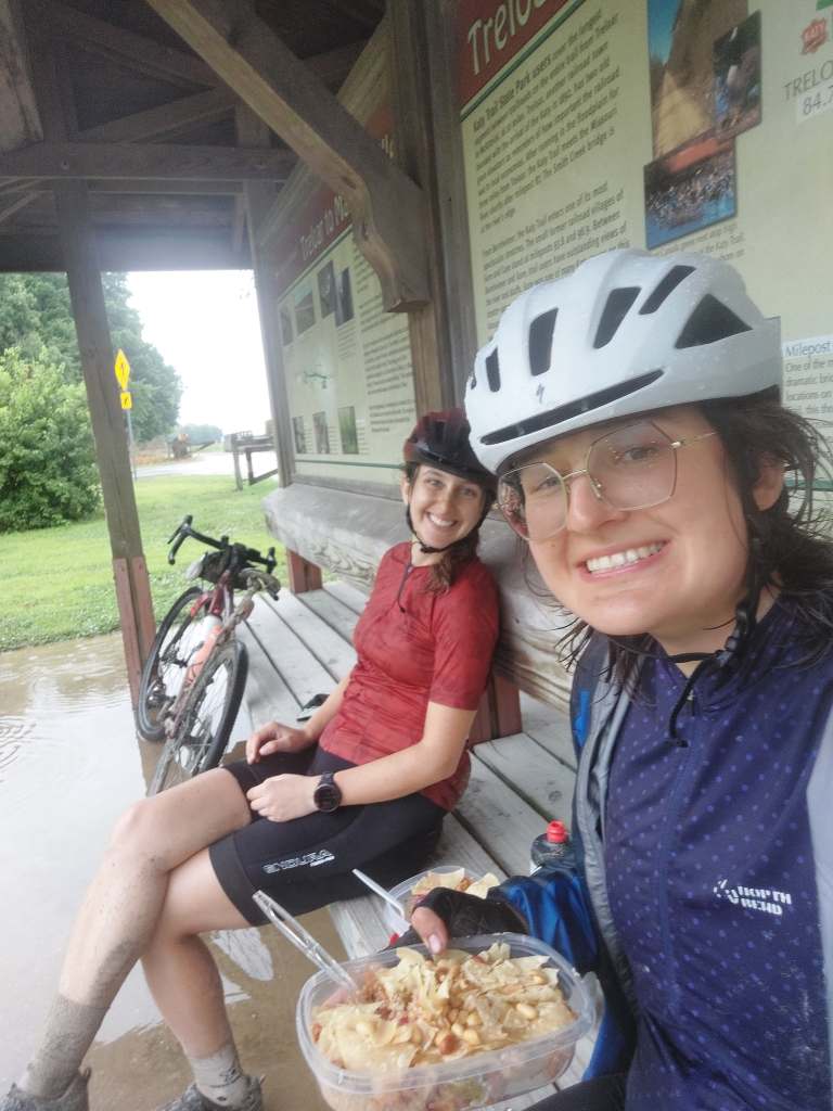 So that’s what we did. We started off going through St. Louis, seeing more parts of the city we explored yesterday, when the sun went away and it started raining. Not heavily, but consistently. This was new. We were used to the afternoon thunderstorms, but now we finally got a simple rainy day. At around mile 27 we got on the Katy trail… where we would continue for the rest of the day. The Katy trail, which used to be part of the Missouri-Kansas-Texas Railroad (also known as the Katy, this is where the name comes from) at 260 miles total distance, mostly by the Missouri river, is the longest developed rail-trail in the US. It is fine gravel, used by cyclists, runners and walkers, with occasional bathrooms and benches maintained. No water fountains, but we asked for some at a restaurant and also realised that we don’t really drink nearly as much in the cool rain. In the rain, the gravel got nice and mushy, which had the effect of reduced speed and muddy backs.
