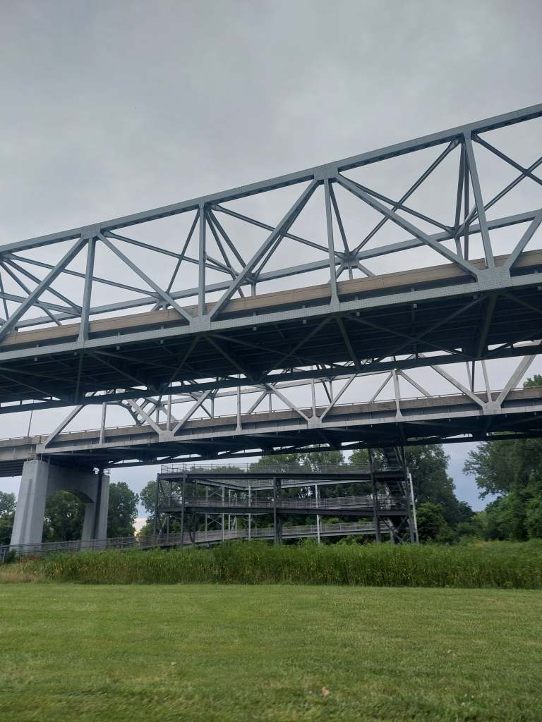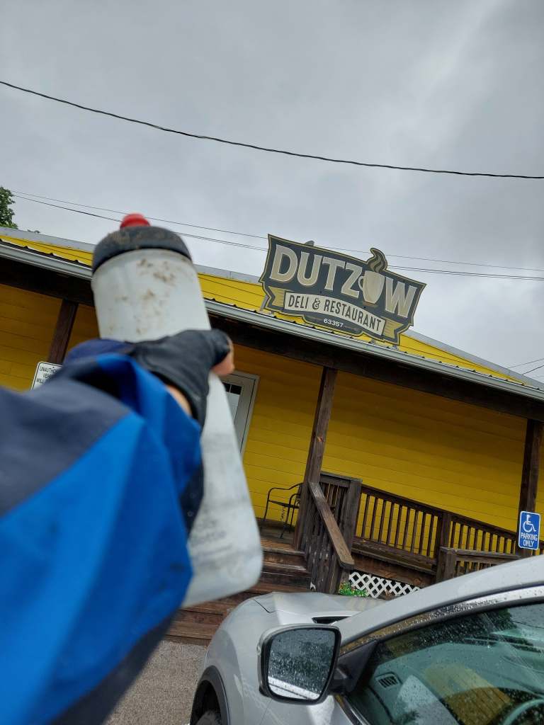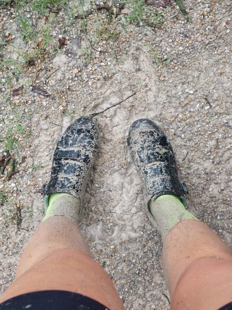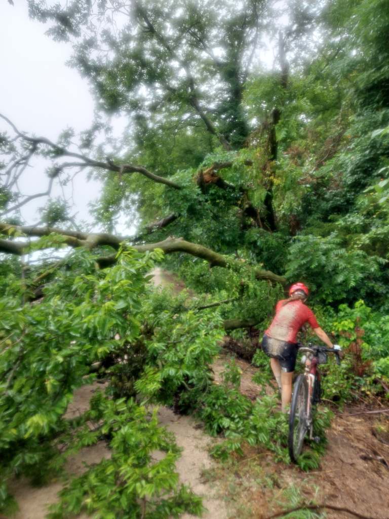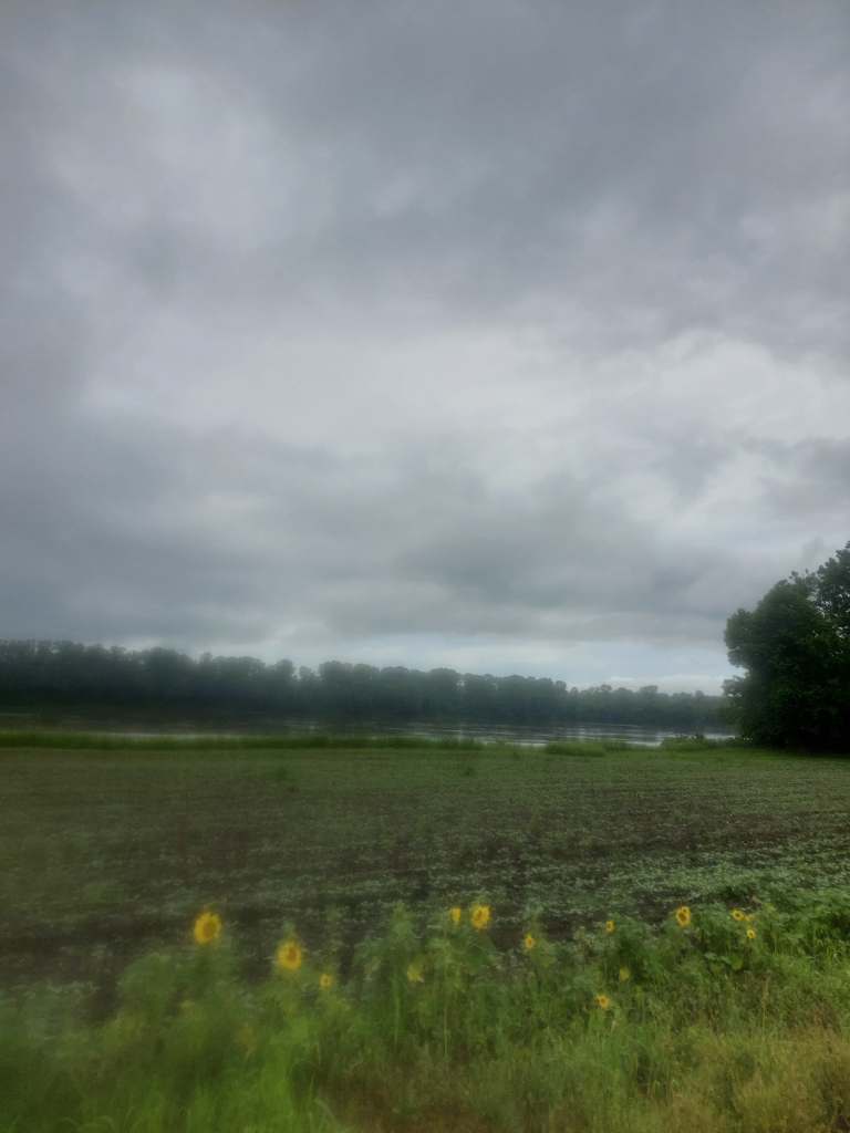 So that’s what we did. We started off going through St. Louis, seeing more parts of the city we explored yesterday, when the sun went away and it started raining. Not heavily, but consistently. This was new. We were used to the afternoon thunderstorms, but now we finally got a simple rainy day. At around mile 27 we got on the Katy trail… where we would continue for the rest of the day. The Katy trail, which used to be part of the Missouri-Kansas-Texas Railroad (also known as the Katy, this is where the name comes from) at 260 miles total distance, mostly by the Missouri river, is the longest developed rail-trail in the US. It is fine gravel, used by cyclists, runners and walkers, with occasional bathrooms and benches maintained. No water fountains, but we asked for some at a restaurant and also realised that we don’t really drink nearly as much in the cool rain. In the rain, the gravel got nice and mushy, which had the effect of reduced speed and muddy backs.