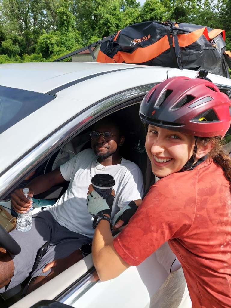 Anyways, I think it was around mile 60 when we met up with the car for some lunch. We had packed a bunch of snacks, but its really nice to have actual food (dinner leftovers!). Time until lunch had flown very quickly, but afterwards it slowly started to slow down. Luckily the sun came out for a bit and Ishaq and Tian – our driver and passenger for the day – brought Greta some (lukewarm gas station) coffee.