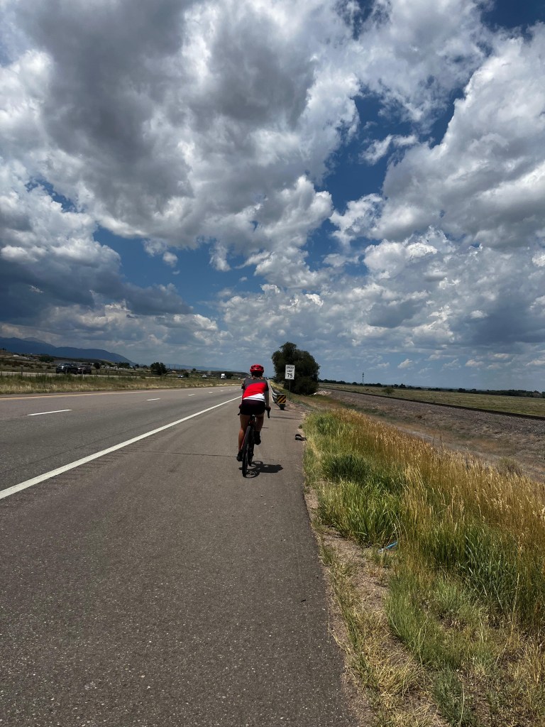 After more riding, I encountered Interstate 25 with a 75 mph speed limit. The number of cars on this highway was overwhelming, but the large shoulder offered some semblance of safety. The exits are the trickiest to bike across because you never know if a car is exiting when they are moving so fast. I was looking forward to rest stop 3, but surprise! It’s closed! I moved on, and after ignoring Joseph’s route that would have taken me off Interstate 25, I finally made it to rest stop 4. I am finally resting at a cafe after fifty miles of continuous biking. Luckily, the weather wasn’t too hot today, and 2 liters of water were enough to carry me through those miles.