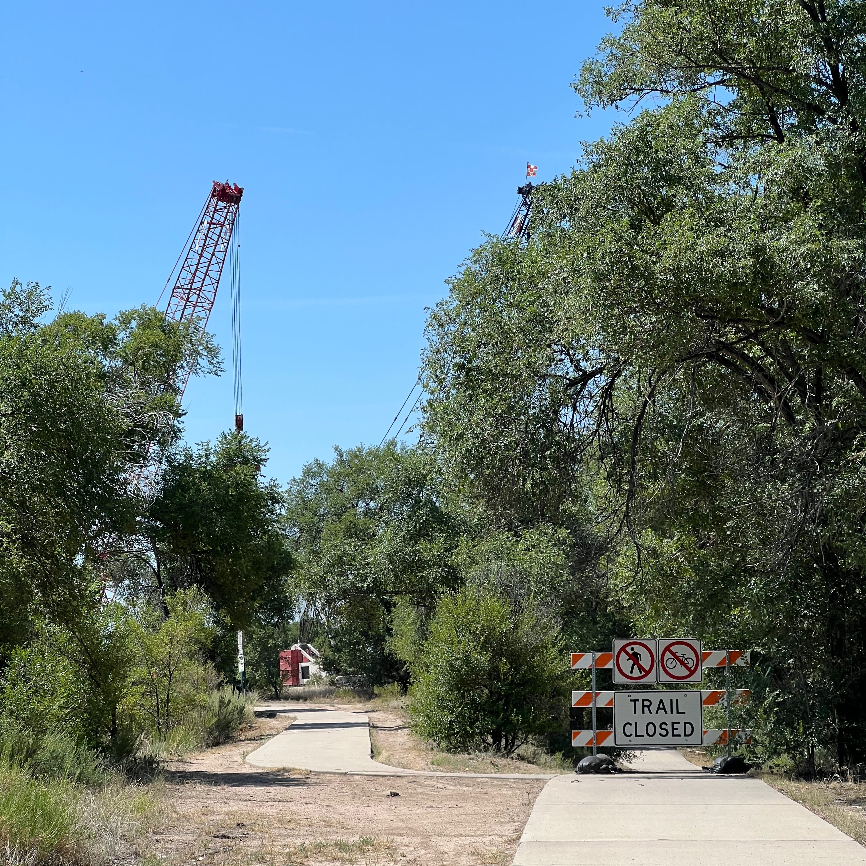 After the first rest stop, I didn’t see the rest of the bikers for the next 80 miles and embarked on an adventure by myself. I skipped a second rest stop, which is a cafe in Pueblo, because I didn’t want to ride an extra mile into the city. However, I heard later that Pueblo is a cute city with many colors and tiny boats. After leaving Pueblo, I faced my first obstacle: a trail closure. Normally, I would’ve just biked past the sign, but the size of the sign made me pause. I rang up Ruth to inquire about next steps. Then, I saw another biker coming from the other side of the sign. Surely, the road can’t be that bad if other bikers are riding on the trail. Two thousand miles on the road have emboldened me to ignore signs. I pressed on and found out why there was a road closure. Construction for a new bridge caused chaos in a section of the road, but nothing I couldn’t walk through. Looking at the half-built bridge, I realized that any of the unsecured concrete platforms above me could crush me.