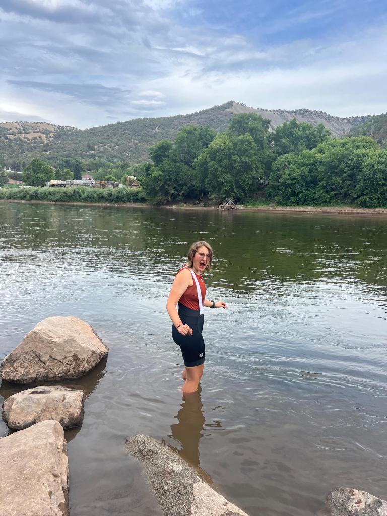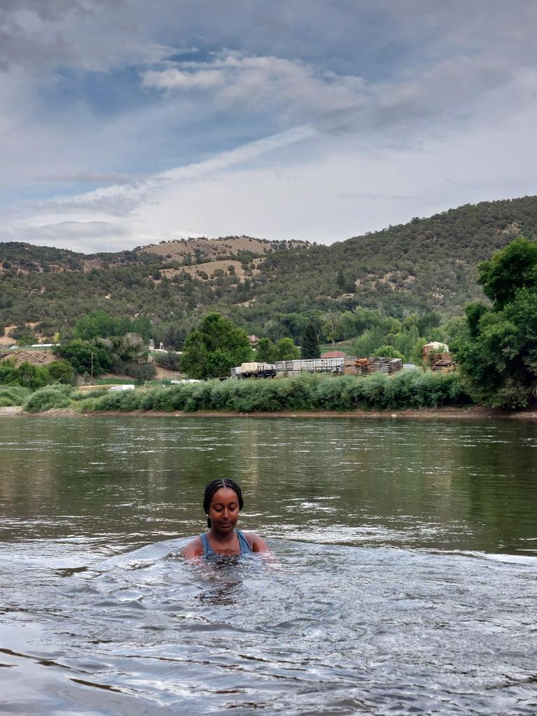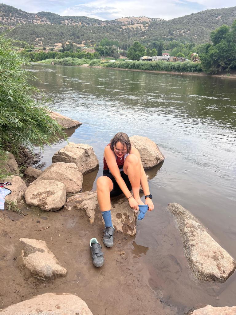 It’s so warm out that we start scheming to find a body of water to jump into. We did it yesterday, so why not two days in a row? We find a great spot to hop in the Colorado River. Unable to swim due to the speedy current, we resign ourselves to squatting. Ramona sees a fish, and I’m jealous so I also try to see a fish. Ramona is greedy so she wants to see another fish. We keep hearing splashing but turn our heads too late to see anything. After 5 minutes of fish hunting, we decide to give up on the elusive aquatic creatures and keep biking.
