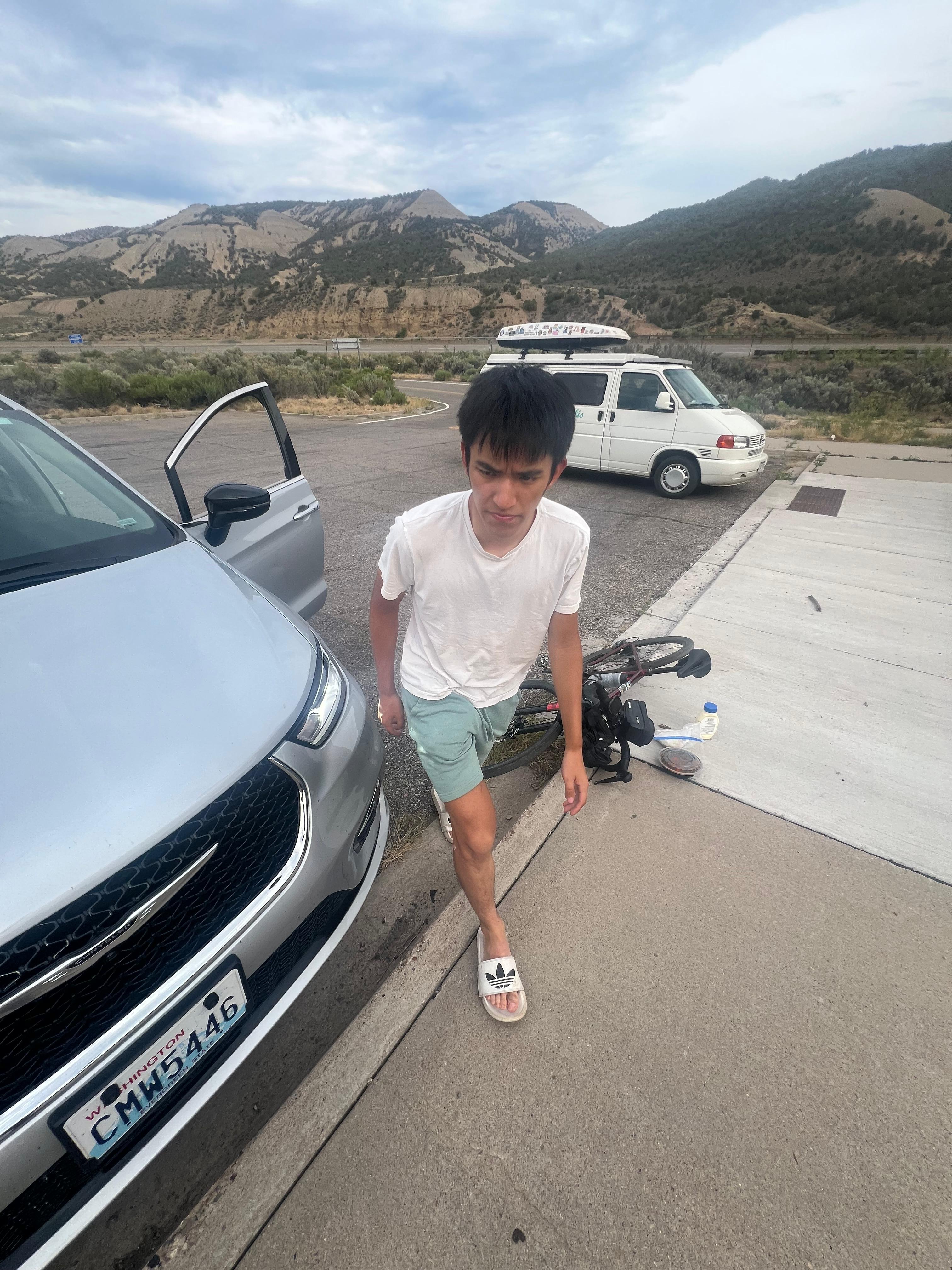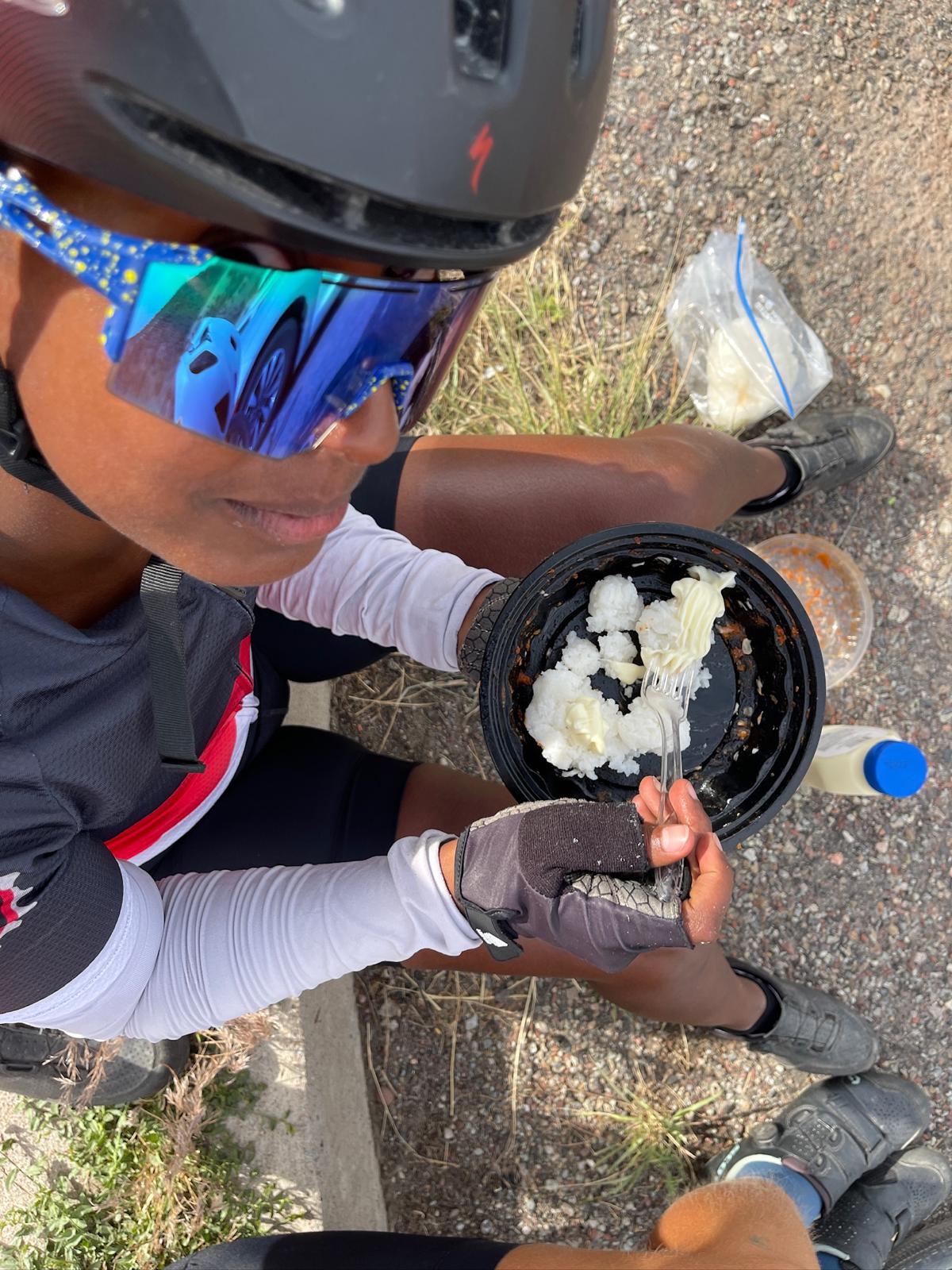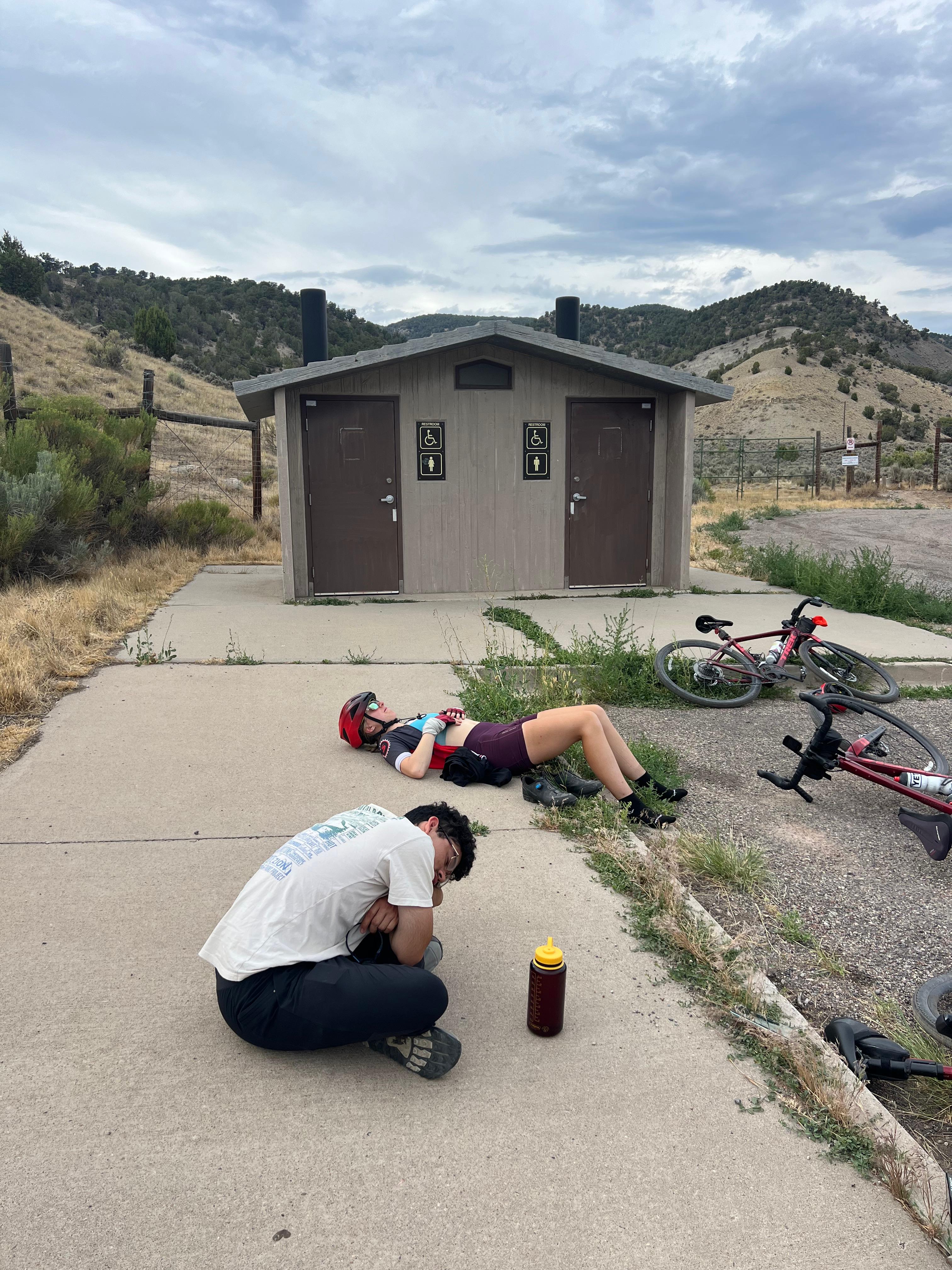 Honestly, the middle of the ride was kind of forgetful compared to the epicness that occurred at Vail Village. The scenery turned more desert-y, and the air got a little warmer. I call my dad at rest stop 3, and he watches me eat spaghetti in front of the massive USPS sign I’m sitting in front of. It’s his brother’s birthday tomorrow, so my parents are preemptively celebrating at his house. I wave hi to my uncle and cousins, and they also watch me eat spaghetti in front of the massive USPS sign.