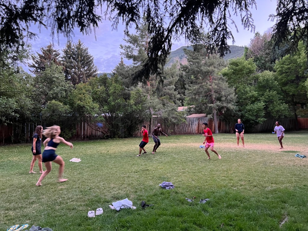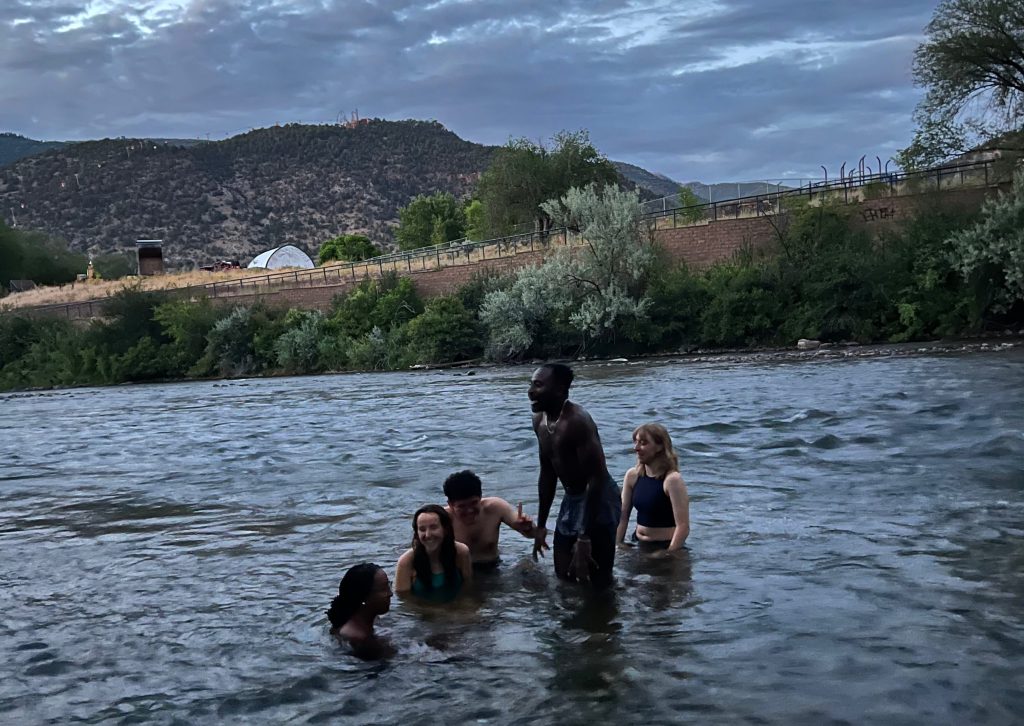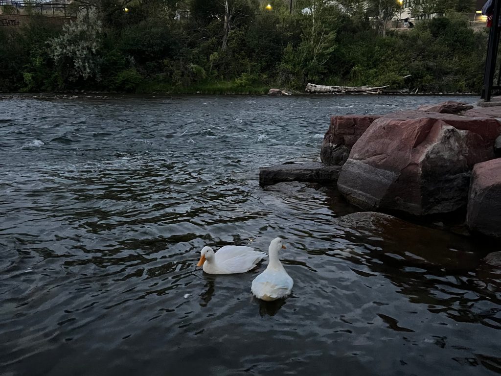Just as I thought the day was ending, we shuffled our way over to the freezing Colorado River. We played man in the middle, a game created by Charles, similar to dodge ball, except that the team escaping the bean bags was in the middle of a square play area. Ishaq took out Ramona with a hit to the face, which frightened Sarah enough to end the game. Luckily, she was fine. The Spokies entered the freezing river and swam along the current. Two pet ducks who were out for their evening swim also joined the Spokies.