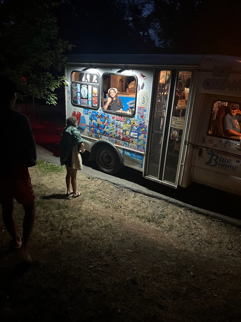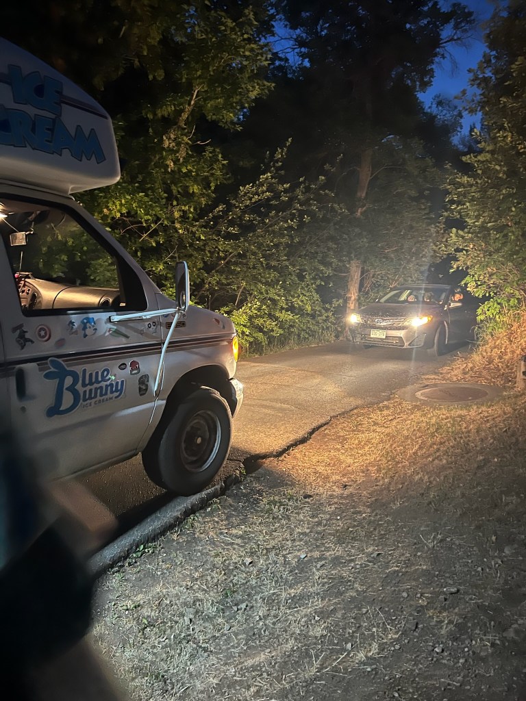 Soon enough, the evening hit, and we were just about to leave when an ice cream truck pulled up out of the darkness. The duck owners were also trying to leave, but since the road was only one car wide, the ice cream truck and the duck owners had a faceoff. Unfortunately, the ice cream truck lost, but Greta and Charles acquired ice cream!