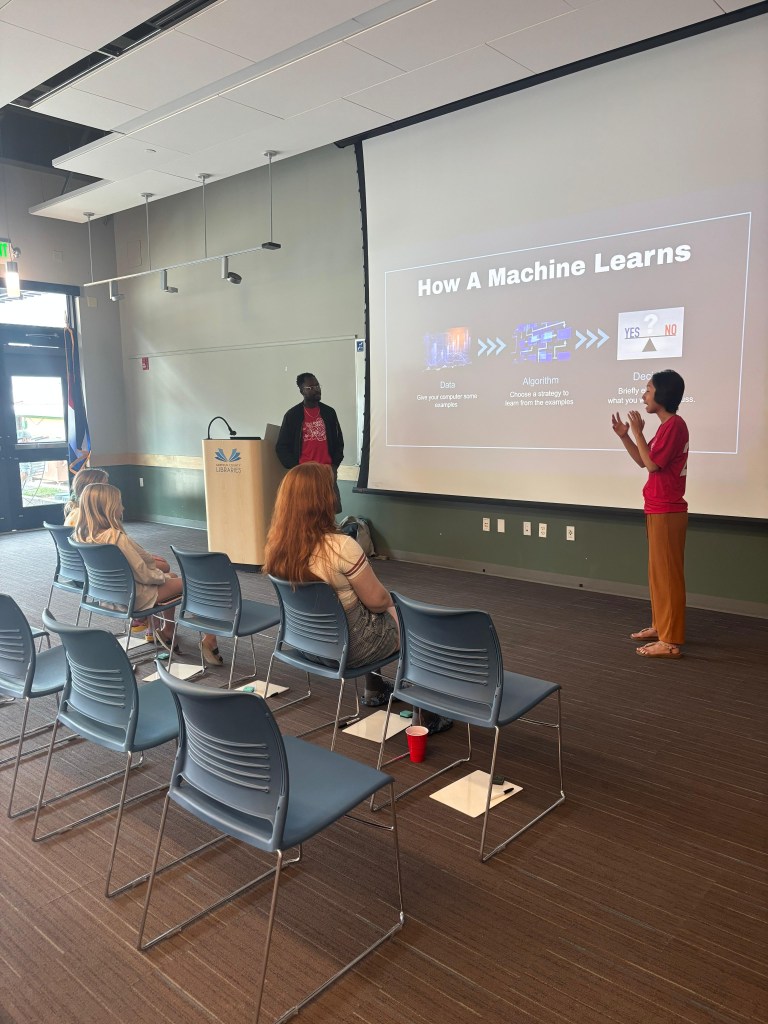 Ishaq and I have a machine learning festival workshop that we perfected over the past seven festivals. At first, other Spokies were skeptical about the fun-ness and hands-on nature of our class; however, we adapted our workshop to be engaging for all ages, from kindergarteners to highschoolers. We started each session with a presentation of how AI is present in our lives through ChatGPT, Snapchat filters, and self-driving cars. Then, we broke down machine learning into three simple steps: data, algorithm, and decisions. The majority of our class included four amazing activities/games courtesy of Ishaq and me.