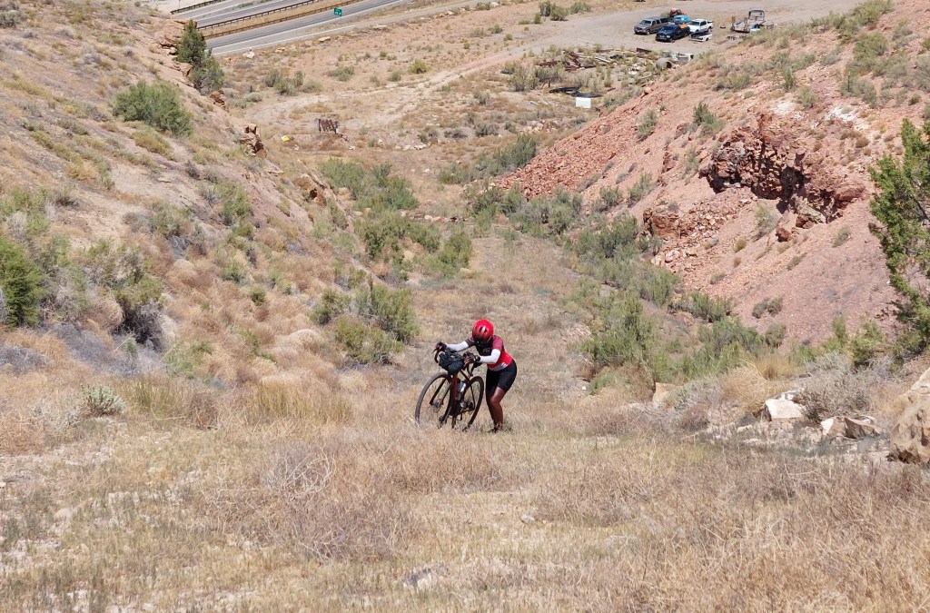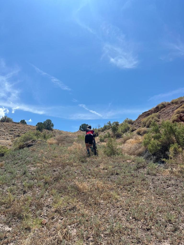 Me and Ruth let others know about this scam, but ultimately decided to climb the hill in hopes that there would be an existing road somewhere on the top of the hill. It took us solid 20 minutes to climb the less than 0.2 mile long stretch. There were times I thought that if my foot slipped, I would probably roll back down with all my bike, hit the prickly bushed and I was not sure I would have it in me to try again. But we persevered and made it up. And, guess what, there was a gravel road up there after all.
