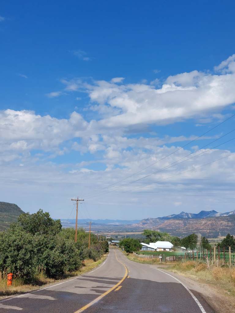 The next day, somewhere during our 115 miles, many of which we spent looking at a bleak, dry and flat landscape around us, I did a redo of a famous poem as a way to say goodbye (at least for now) to the Rockies, which we officially exited when we left Grand Junction. Here it goes.