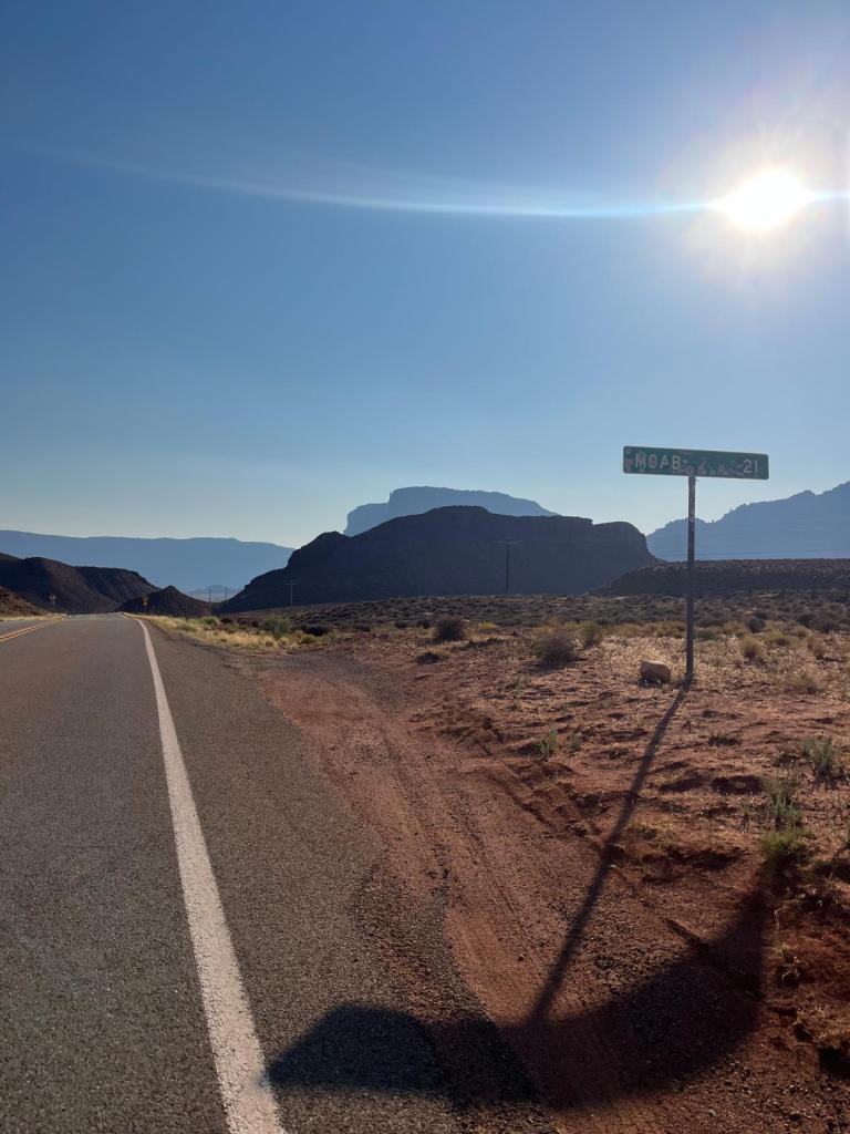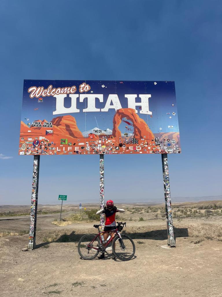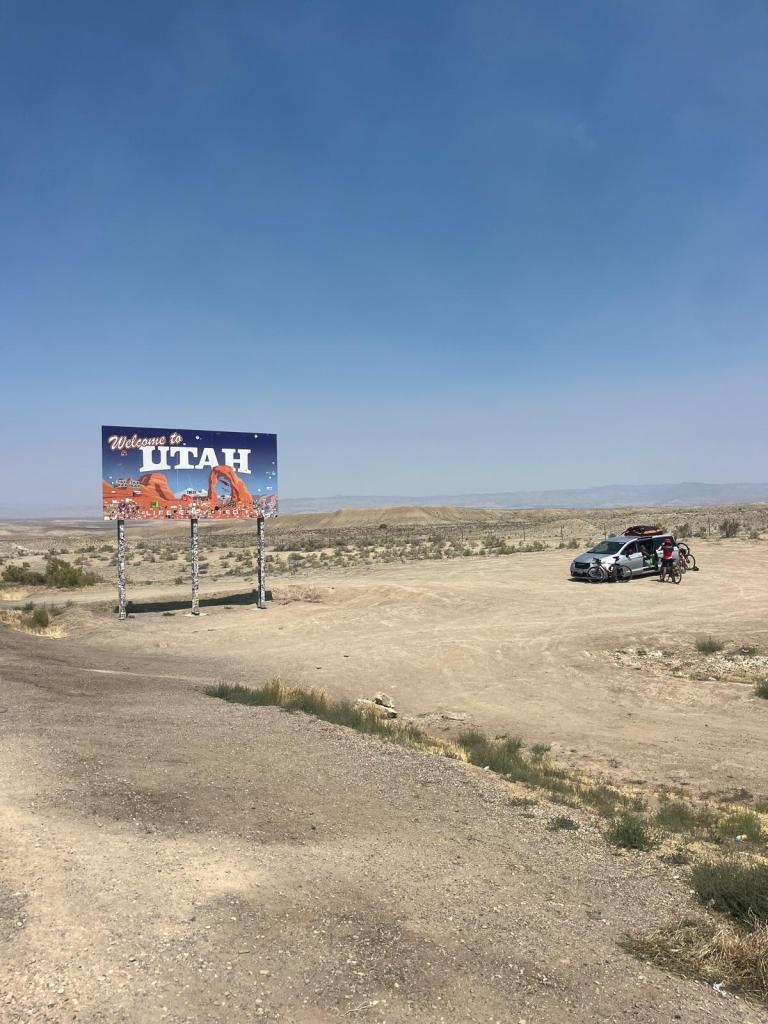 this is when we start making our way into more desert sceneryāwhat iāve been joking is āmy territory.ā even ramona commented on the actual excessiveness of shrubs: having made a quick stop in nevada herself, she (and i) know what REAL desert will look like. we start chit-chatting, and some of us come up with 4-lined poems, to pass the time. we hit a bit of gravel (tianās least favorite thing ā¹ļø), but thereās an unexpected bathroom at the top! then, after a quick, short climb, we speed down to the sign signaling that we had made it to utah!!! i was a bit sad, since from here on out all the states will be old news to me, but was comforted knowing that i actually would be seeing new areas within these āoldā states. even so, traveling by bike really gives you a truly unique perspective on places and the communities that occupy them, so i realized i was actually excited to get to see familiar places in a new light! i ate my first of 2 sandwiches (my 1st double sandwich day), we took some pictures, and set off into the sands of utah š¦