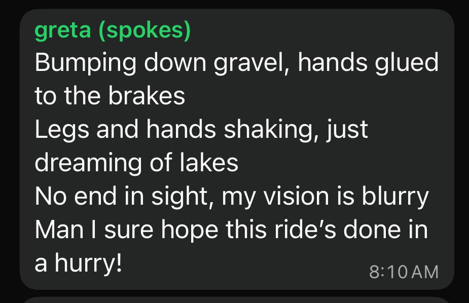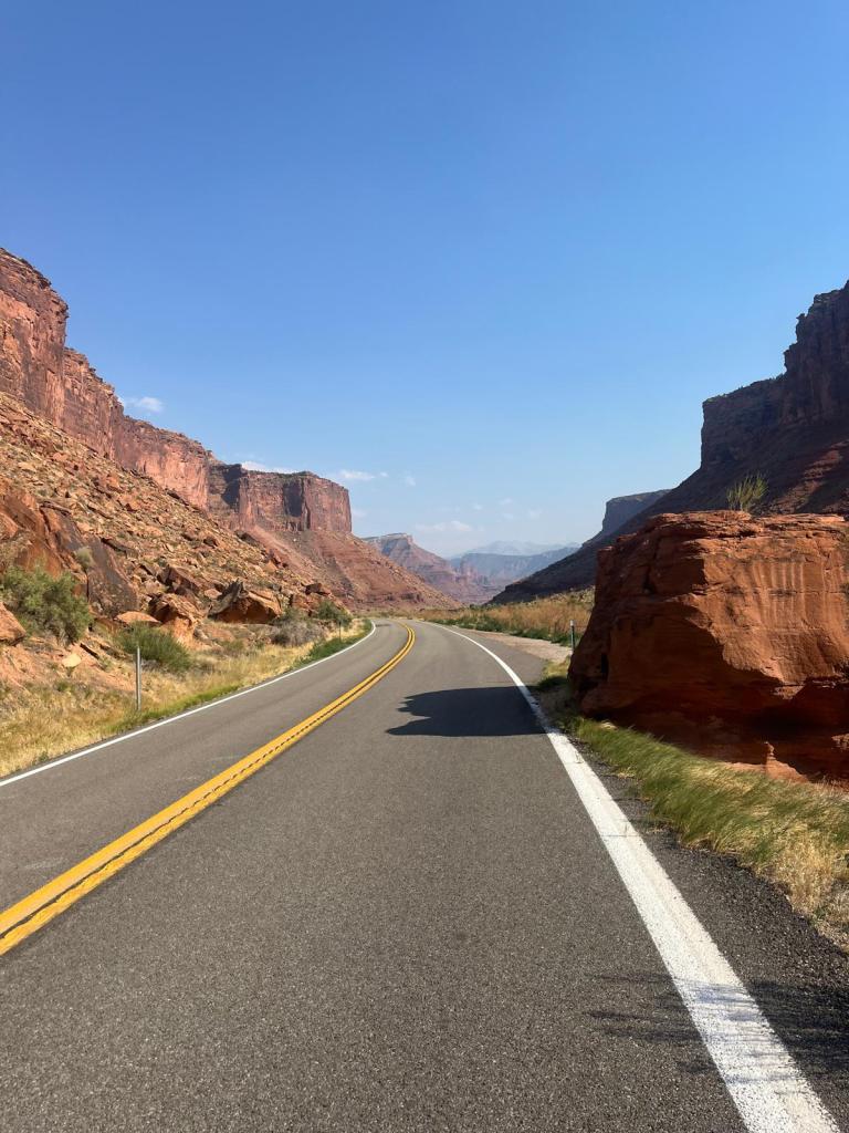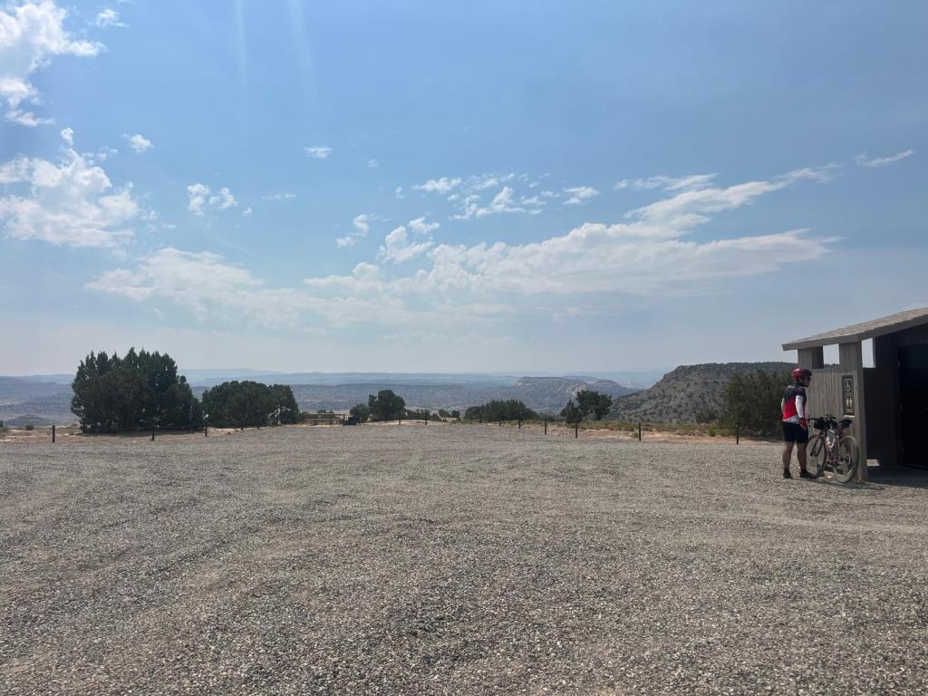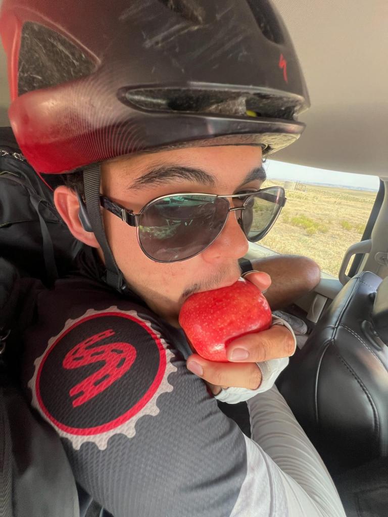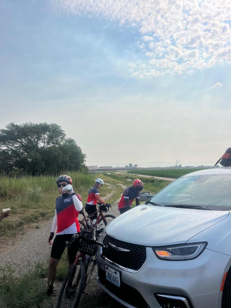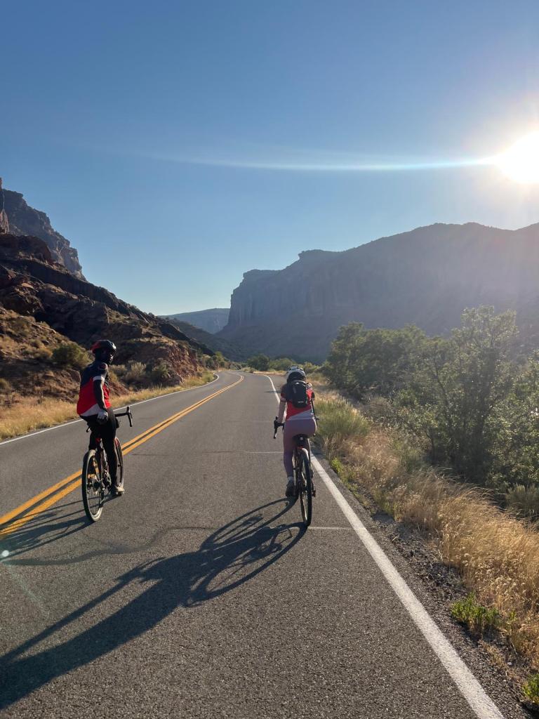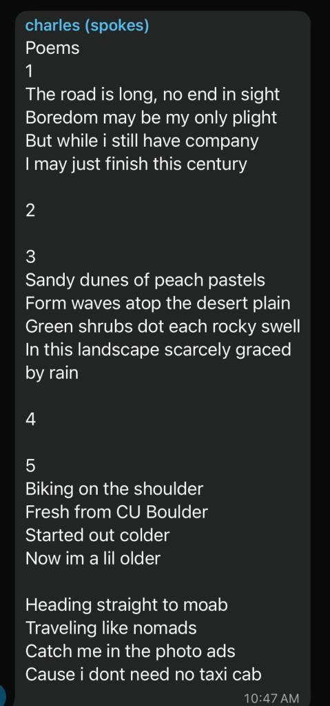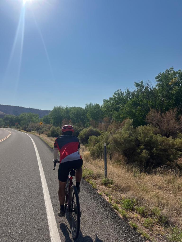 knowing the scarcity of society for the day, i stepped into the restroom real quick before heading out for leg 2, and when i came back out, i see that everyone had already left (except for joseph): uh, rude much? š anyways, the two of us set out to officially leave grand junctionāand civilization. we spot another cyclist on the road, and while joseph keeps insisting it’s ramona, i know it’s not (it isnāt her). i decide to call my parents to check in on things: i havenāt mentioned it yet, but i would be seeing my parents in moab!!! long story short, we had a housing gap in moab for quite a while, and they decided to fill it in! they have been meaning to go to moab for a while, and it would also be a good chance to be with me for a bit since i would be gone all summerā¦sorry :(( they came in the night before, and i hear that they are getting settled and already starting to prep for dinner that night! with rest stop 2 being only a few miles away, i see a suspicious clump on people on the side of the road ahead of me. joseph and i pull over and realize that ramona was having tire issues. the car was also stopped and packed with water, food, and supplies, so we collectively decided to make this an unofficial rest stop 2 and move on to āleg 3.ā