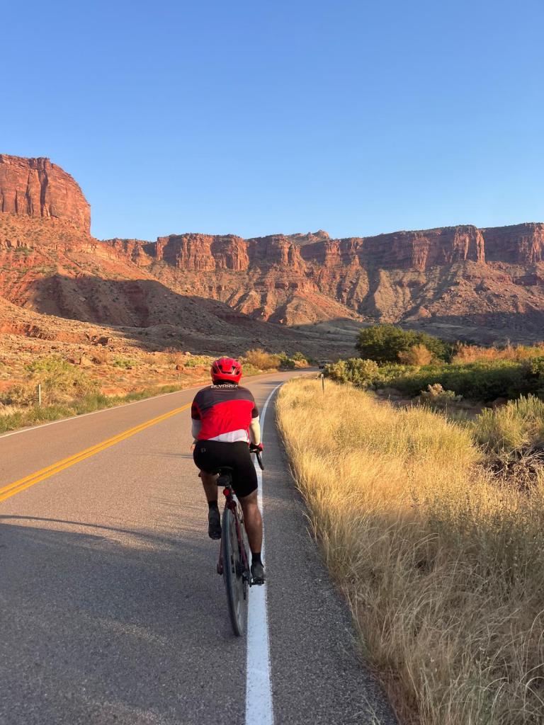 as we begin the final, 10.5 mile leg, we get into single-file, hit a bike trail, and its full steam ahead to moab proper. AND, after hours and miles without service, the bars come back!!! this is especially important because itās been WAY too long since we were able to update my mom on our whereabouts, and (as i predicted), after we were over half an hour late to dinner, she had sent my dad out to backtrack our route by car to make sure we were ok. while we were expected at 7pm, we came rolling in in two waves around 8:45pmā¦sorry for worrying you, mom! surprisingly, i managed to be apart of wave 1, even with a 2 mile climb in the home stretchāwhat can i say, i was VERY excited to see my parents, and VERY excited to SIT. DOWN.