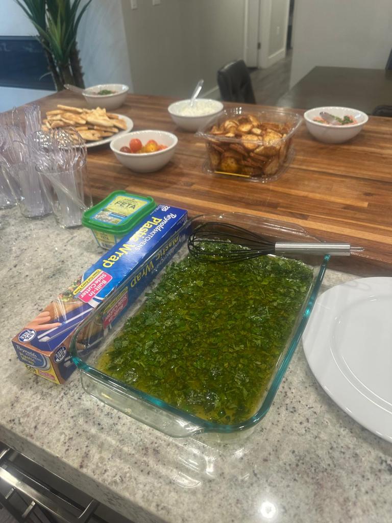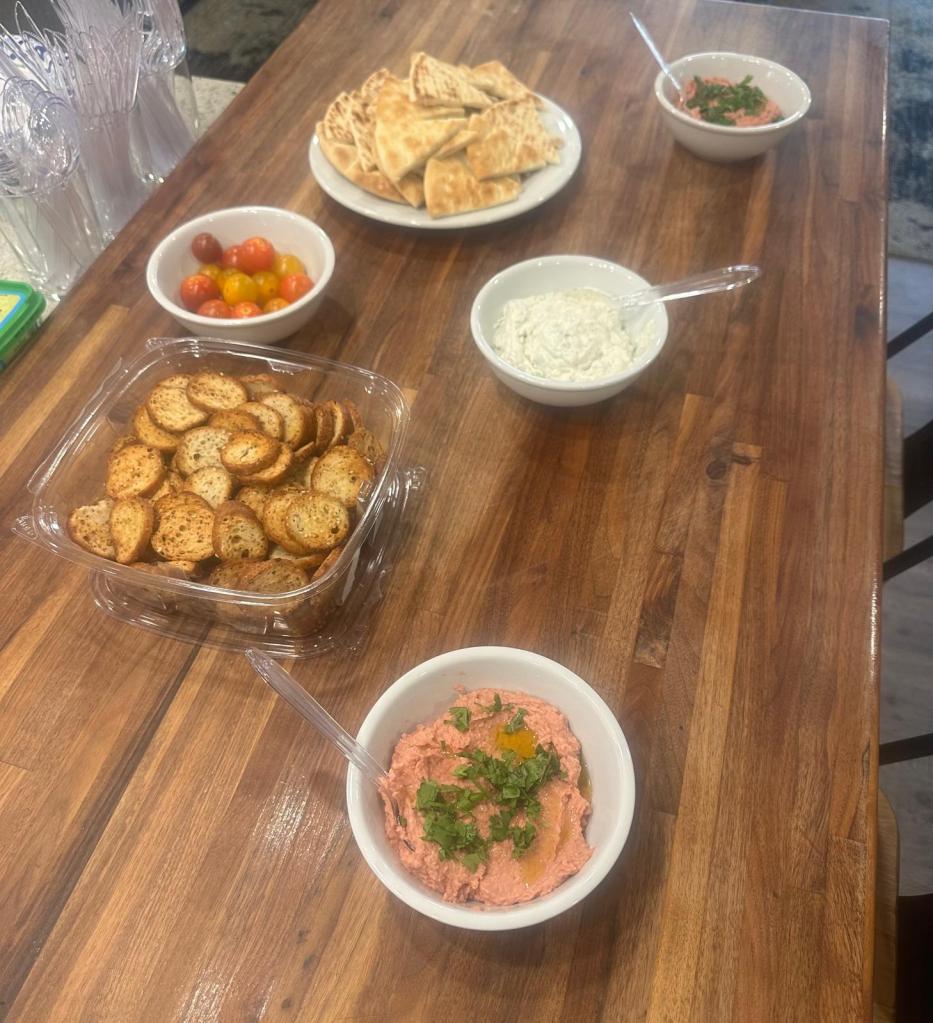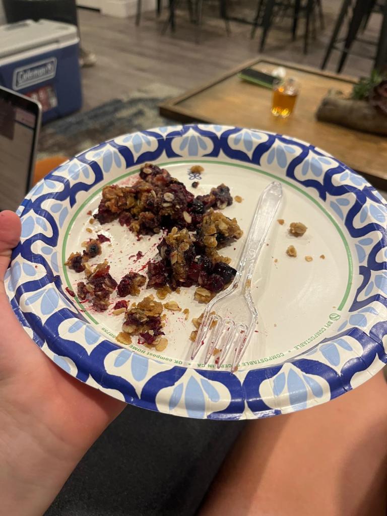 while my fellow spokies helped to start arranging things at our place for the next few days, i was on a mission to track down my parents. i find my dad in the back, and (after a short walk) my mom at the grill making the final preparations for dinner. eventually, both meet at the grill, and i start excitedly debriefing about the day, showing them my cool uniform in-personāgenerally catching up. we bring back and serve dinnerāchicken and vegetable skewers, pita and bagel chips, and hummus! while i was worried the energy would be low after such a long, gruelling day (something i warned my parents about in advance), there is conversation and laughter to be heard all-around. it was very interesting to see two very different groups of people in my life interact, but iāve since heard all parties had a lovely time, which makes me very happy :))