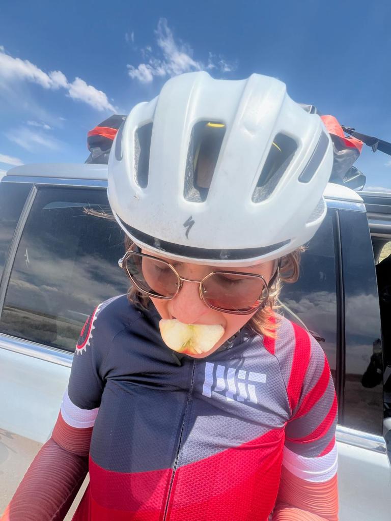 leg 4 was a longer oneā17 miles. by this point though, the whole team was together, so we chit-chatted, played a bit of biker leap frog, and just tried to make it through the chaos of I-70. as various signs warned us that there were no services for the next bajillion (read: 40-50) miles, we realized we were truly in the middle of NOWHERE. this is where i started to feel it: i was consistently just a tad uncomfortable in my saddle, the wind was just a bit too intense, the sun a bit too bright, the road ever so slightly inclined, AND my podcast wasnāt that interesting to me. the fact that we were just going straight for MILES also bothered me: my biggest dread is making a turn and garmin telling me to keep going for some 10+ number (where thereās no decimal that counts down faster). for the first time EVER, though, there were quite a few ENCOURAGING honks from cars on the interstate!!! this was so fun, and an instant mood-booster for the whole group. we power through and eventually exit to find ruth on the side of the road attempting to make a call, grab some food, water, and MUCH cherished AC, and set off once againāhalf-way through.