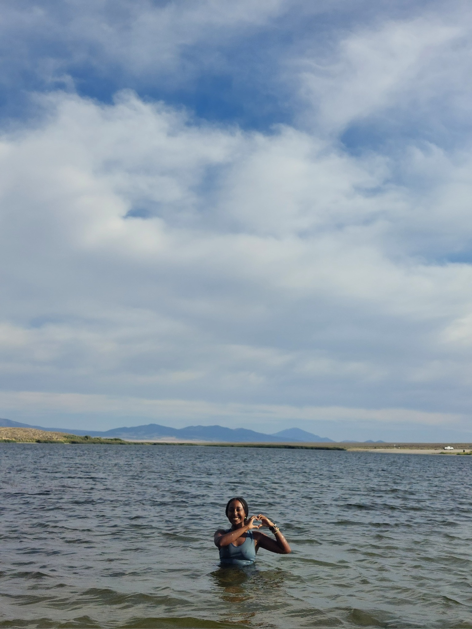 In the final leg of the day, we caught up with Ruth and Ramona, who had ditched their bikes on the edge of a pullout on the side of the road. Our confusion quickly gave way to understanding when we saw a narrow path leading down to the lake, and then, two bobbing heads swimming. Greta, Ishaq, and I pulled over as well. Ruth and Ramona swore the water wasn’t cold (it was frigid) and convinced us to go for a swim. It was very refreshing, though, and we were dry pulling into the town an hour later.