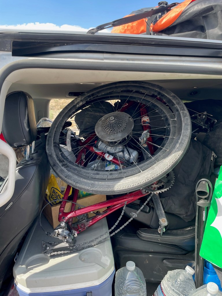 Joseph probably burned himself out or he simply wasn’t feeling it after the events of the morning, because when we reached rest stop 3 at the base of the day’s big climb, he had nothing left in the tank. After resting up for a bit, he decided he didn’t want to finish out the climb. Since there were already 3 bikes on the bike rack (Ishaq, Tian, and Sarah’s), we had to take his rear wheel off to make his bike fit in the car. That left no room in the back for Joseph to sit. I jokingly suggested Ishaq could bike instead.