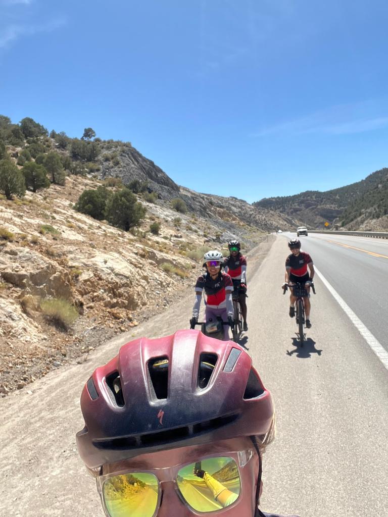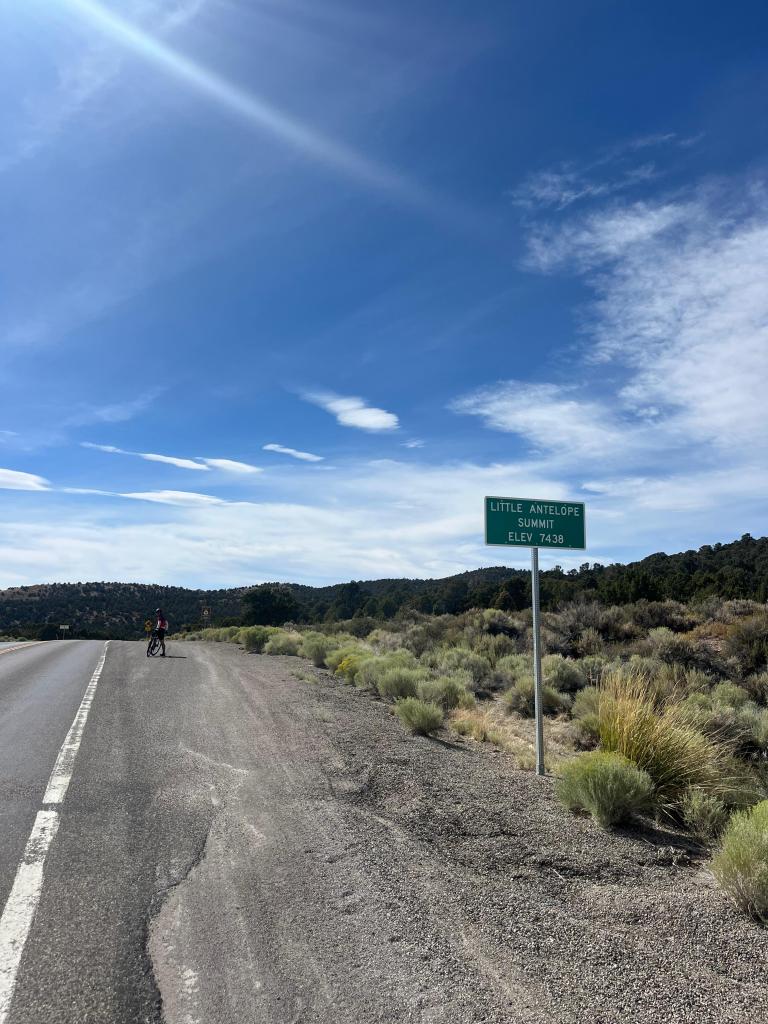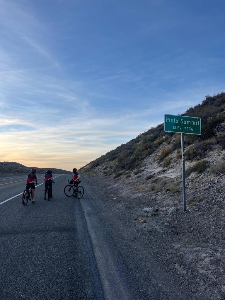 naturally, the highest summit to be climbed that day was in the very last leg. our route planning site says it was almost 1400 feet over about 8.5 miles, but i think our garmin bike computers said something more like 1100 feet over 5 miles. no matter the exact numbers, it was a slow and steady one. the REAL strategy i have realized that works best for climbs is actually NOT trying to drown out your miserable thoughts and aching legs with loud, hype music (while that does work pretty good)—it’s actually distracting yourself by yapping with someone else! since the shoulder was too small for pairing up with one of my fellow spokies, i called one of my friends from back home (who actually goes to college in northern nevada! go pack) to catch up on life. after she kept me distracted for a solid 30-40 minutes (even amongst the occasional gust of wind that made me unintelligible—bless your soul, farrah 💗), greta and ruth caught up to me with about a mile to go. with loud downhills and the end in sight, i let my friend go, and the trio yapped our way to the top. at pinto summit (elevation 7,376 feet), we met up with joseph, took some pictures, and got ready to make the final, speedy push into eureka!
