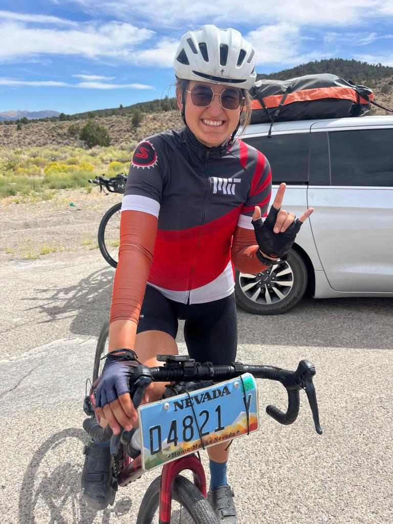 moving on from the pessimistic though, i left rest stop 2 maintaining my good spirits for the next climb and the rest of the ride. i passed by some lovely lavender fields and flocks of sheep 🪻🐑 stopped by a historic marker talking about the silver rush of the late 1800s (and the ghost towns that followed), and pulled into rest stop 3 (sadly, the desolate nature of northern nevada has led to some plain naming and placing in rest stops for our rides). i was happy to see ramona for the 1st time that day, but i was even more curious about what she had strapped creatively to her bike bag—an abandoned nevada license plate she had found on the side of the road. i definitely did not start scheming of ways to get it off her hands…i guess i already have my own, though (even if its attached to the back of my car back in vegas). i ate some of the yummy sandwich ruth had made me (thanks ruth!) before setting off for legs 4 and 5. these weren’t too eventful, besides two more summits climbed, named little antelope (elevation 7,438 feet) and pancake (elevation 6,517 feet) summits, respectively.