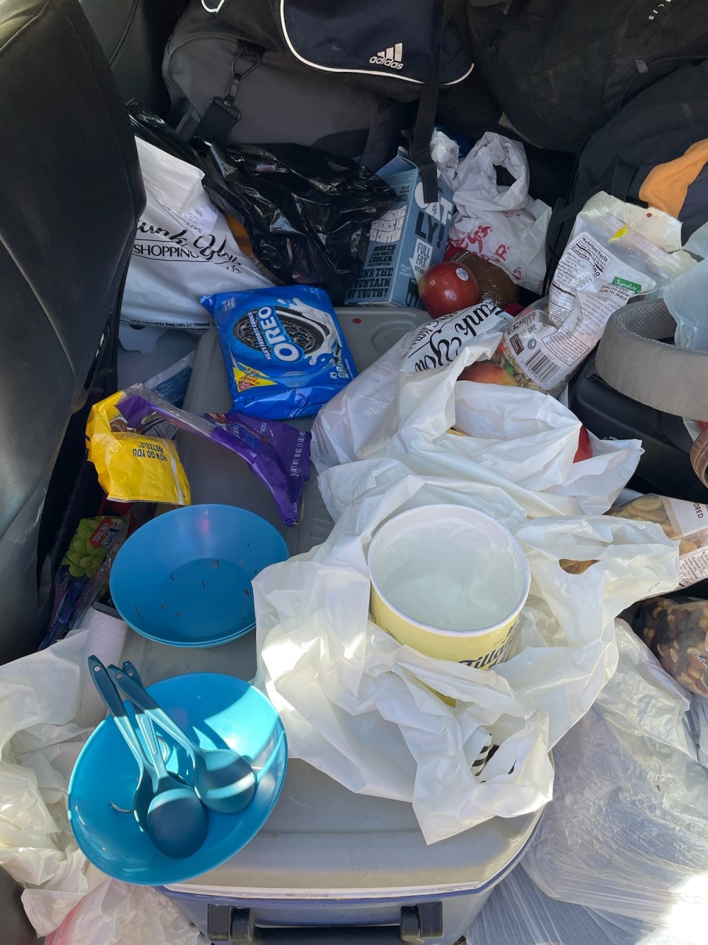 Joseph made up for his lateness with the best possible excuse one might have for such a grave transgression. He had set his mind on one-upping Ruth’s best-driver-ever submission on day 70 with one of his own. He opened the minivan door to reveal bag upon bag of groceries. There were the all the essentials and classic Spokes hits we’d requested for food, of course. Then, fresh apples, oranges, peaches, and a whole watermelon he was planning to cut up for us at the next rest stop. For our delicacies, we had a whole pack of Oreos and a family size Blue Machine Naked smoothie. AND, there was a “mystery surprise” that would be revealed later. I love mystery surprises.