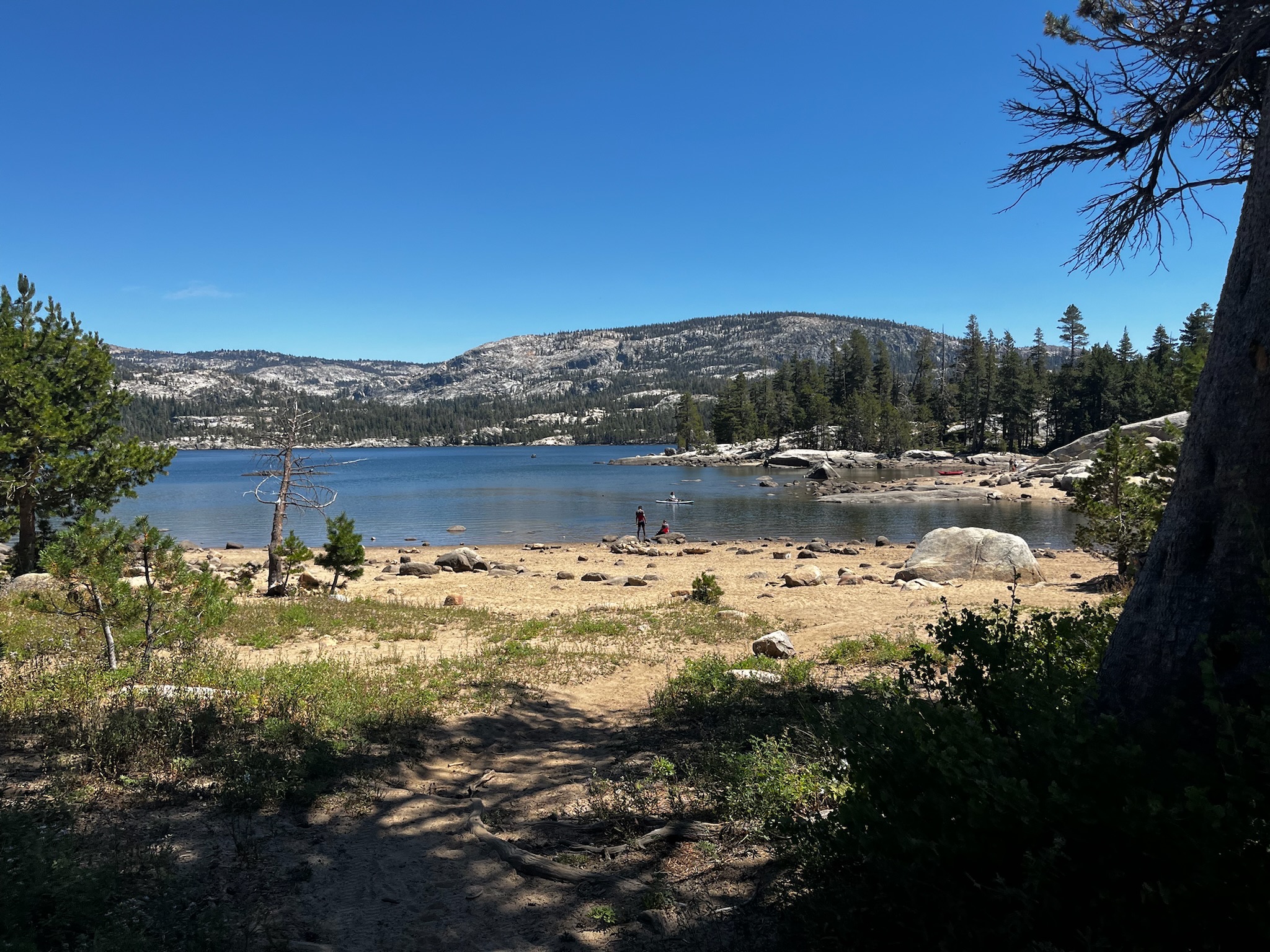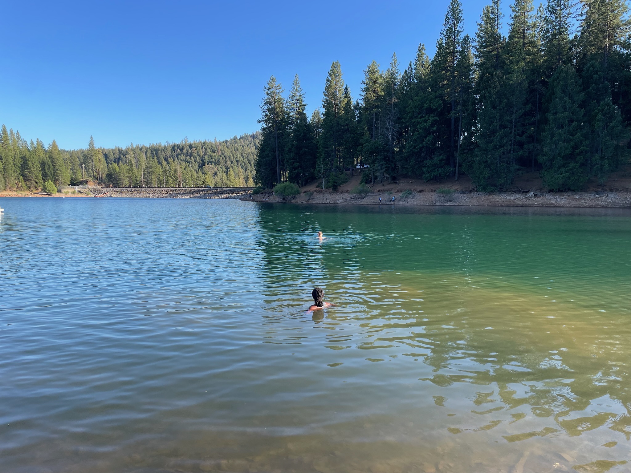 We clarified the access road to the recreation area was free for bikers, so Greta, Ishaq, Ramona, Ruth, and I dropped down to the lake. Ruth and Ramona achieved the rare double swim day. I joined them in the lake while Greta and Ishaq napped. With the sun getting pretty low in the sky, we all agreed to skip the last rest stop and head to the final destination in Placerville.