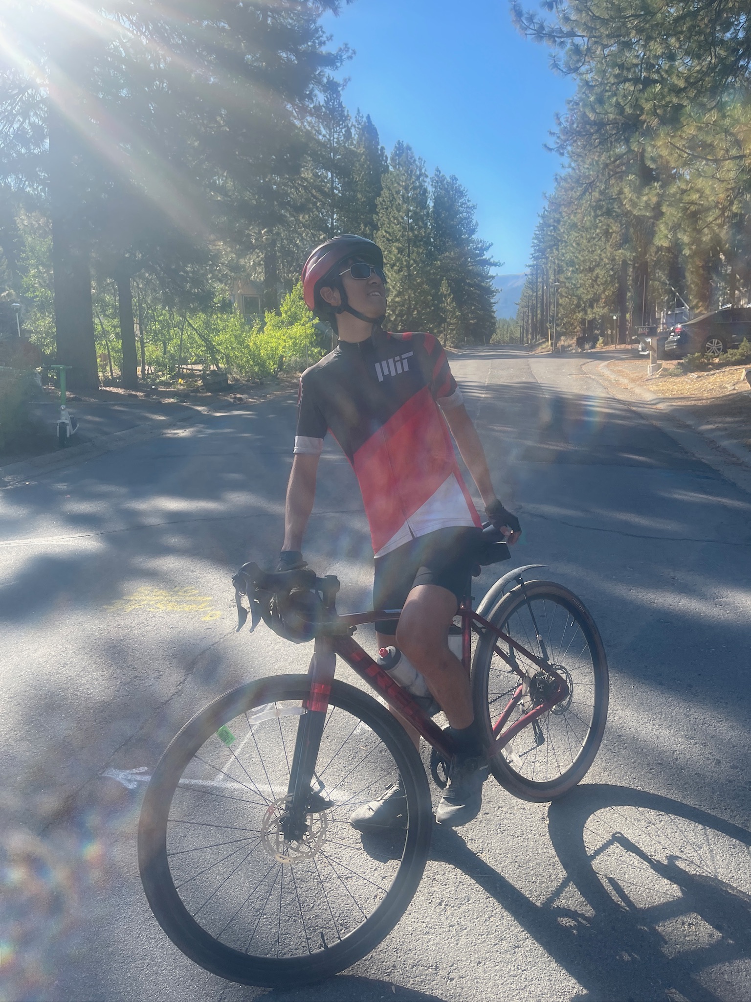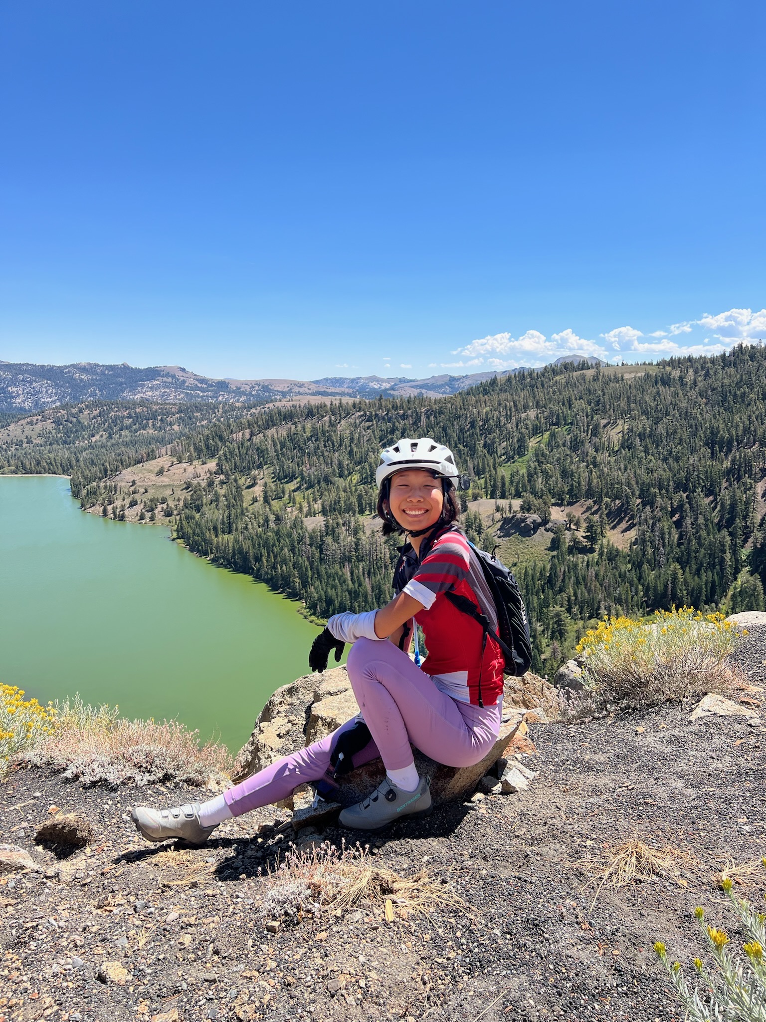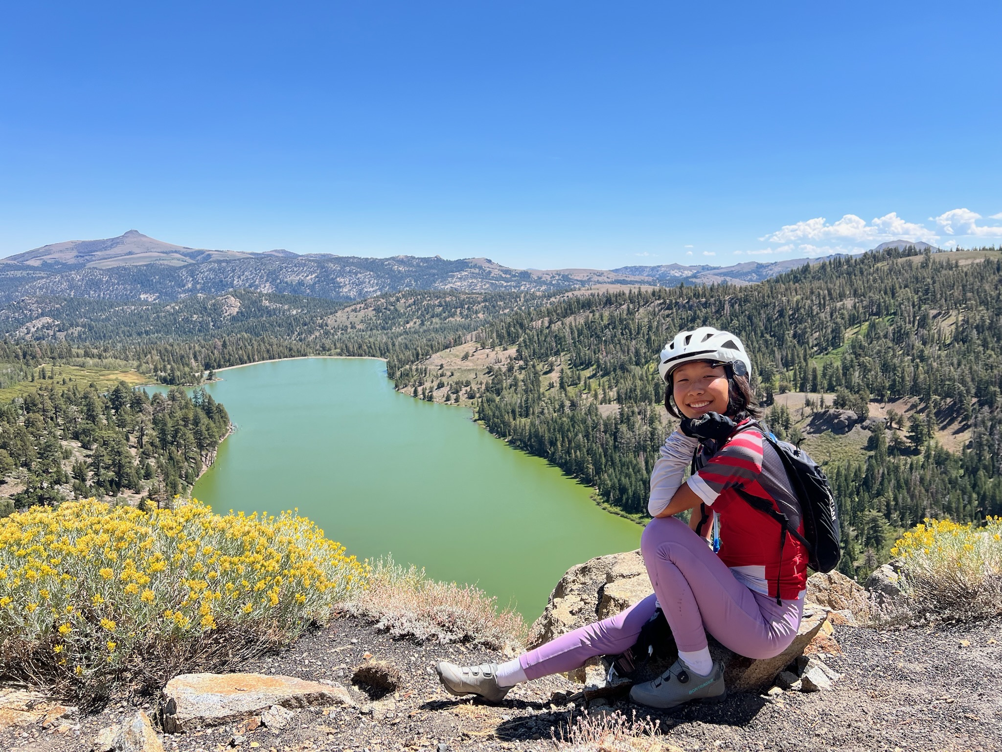 After a short wait (for the dilly dally club, I think Ishaq waited for like 20 minutes), our side got the go-ahead, and we kicked off the second half of the ride together, a descent that would take us from 8,000 feet down to 2,000. Sarah slowed down abruptly at one point, so those of us behind her (Ruth, Ramona, Greta, and I) who passed her while descending waited for her at a turnout. Unfortunately, a bug had flown into Sarah’s eye and she had pulled over and tried to rinse it out. Her eye was still bothering her, so Sarah hopped in the car to try and get some eye relief until it was safe for her to bike again. Ruth and Ramona, finally relegated to the back of the pack after their blistering start to the day, decided to join the dilly dally club.