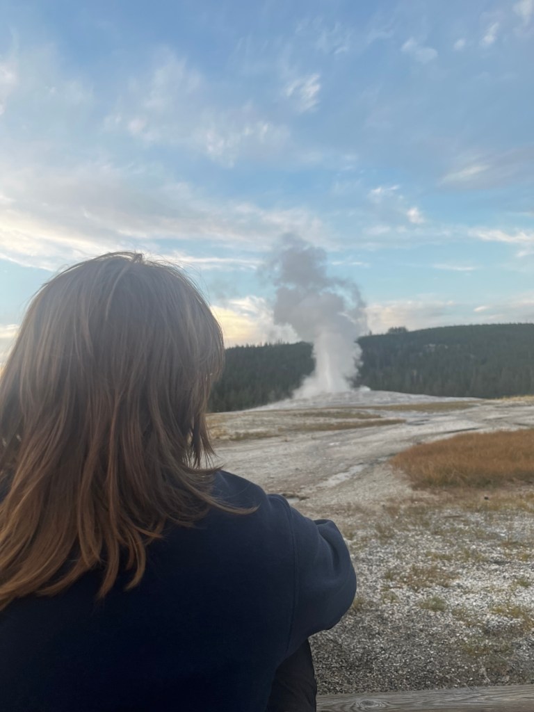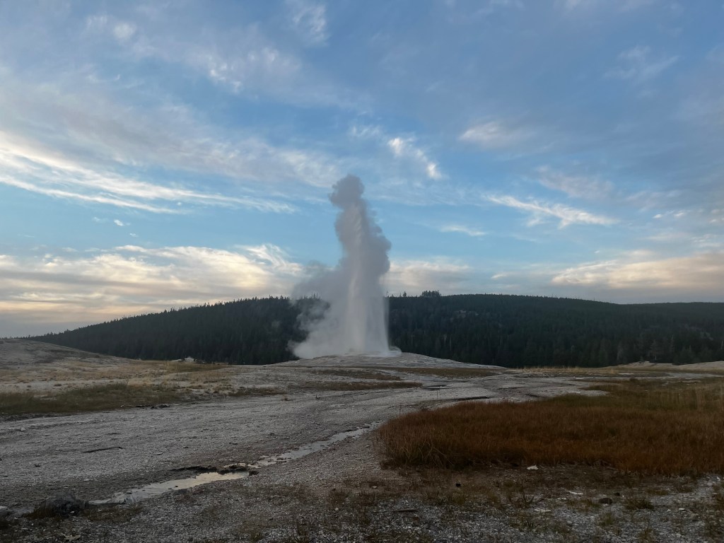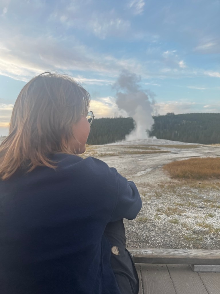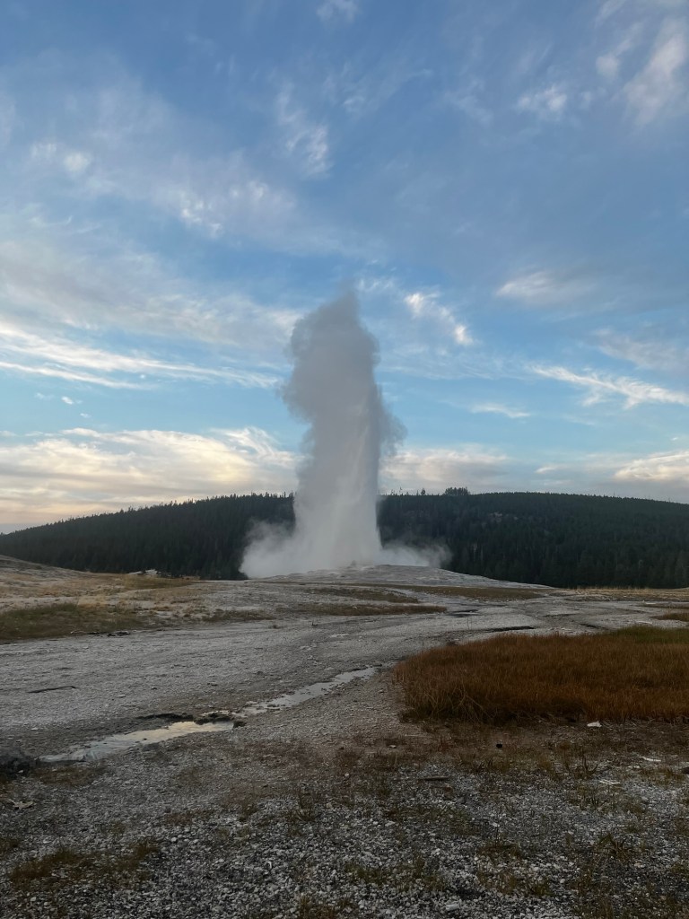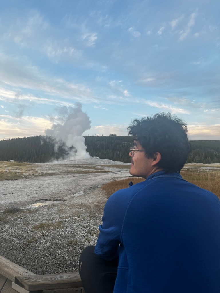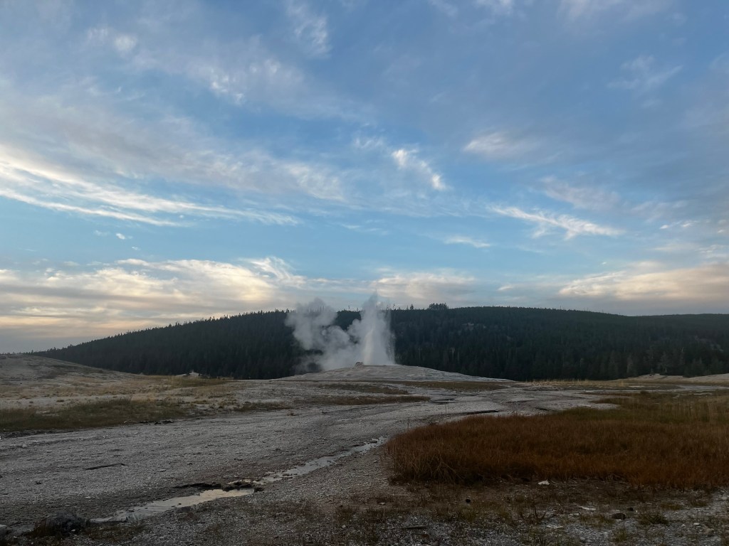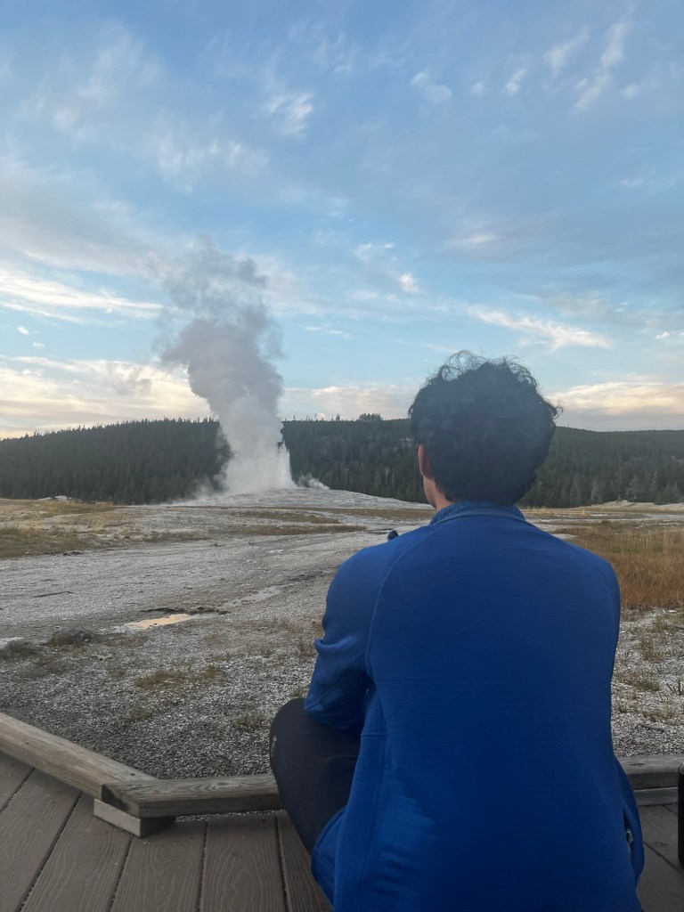 Well, that sucked. And, worse yet, we were barely going to have enough time to see any of Yellowstone. We got some smashburgers for lunch and then gunned it South into West Yellowstone. We managed to make it with a bit over an hour of daylight to spare and asked the people at the ranger station what we should do (and used the restroom there, of course). We decided that we should just try to go and see the Old Faithful geyser located at the other end of the park, and if we had time, we could backtrack to some of the other attractions. Speeding through Yellowstone felt like I was running through an amusement park, seeing all of the springs and geysers (attractions and rides in this analogy) but not being able to stop at a single one. Oh well, maybe next time I can stop properly. We eventually made it to Old Faithful. We had 15 minutes to spare before it was set to erupt. We went into the visitor’s center, used the restroom (again), got a sticker, and then sat down on the floor right in front of Old Faithful. The pictures don’t quite do it justice, but it was pretty cool. It’s also amazing how so many people can gather quietly to watch a marvel of nature.