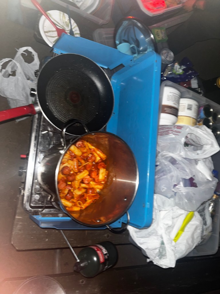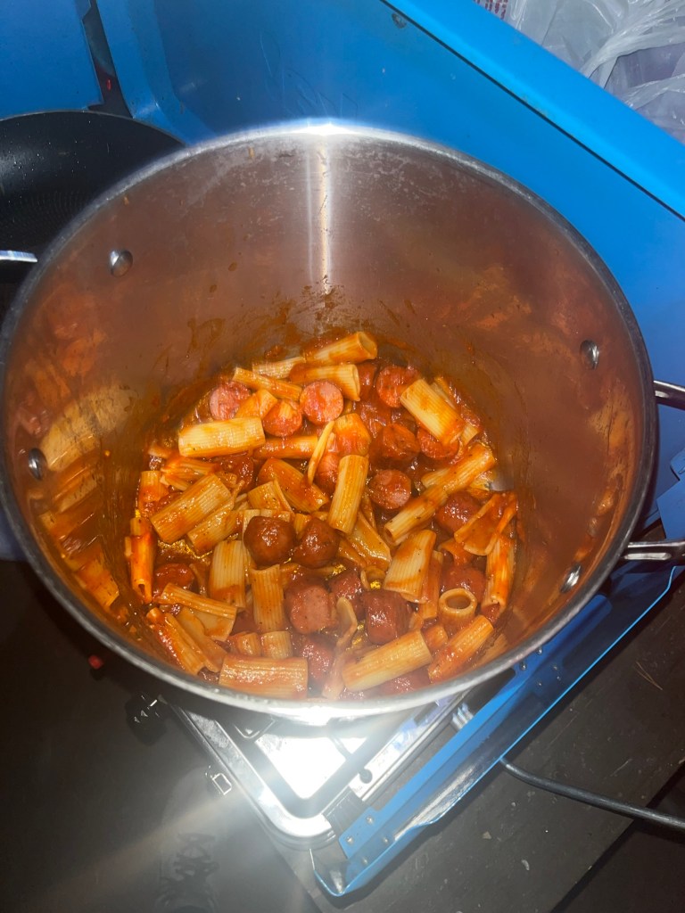 Once we had gotten our fill of Old Faithful, it was unfortunately time to leave. I wish we could’ve spent more time at Yellowstone, but I suppose I will need to dedicate a future trip to it. The sun was setting and we still had to make it to our campsite in Grand Teton National Park. Darkness quickly crept in as we made our way across park boundaries, and we eventually made it to Lizard Creek Campground. Now that our stove problem was fixed, we could finally make the sausage pasta we had been trying to make for the two previous nights. It was quite good.