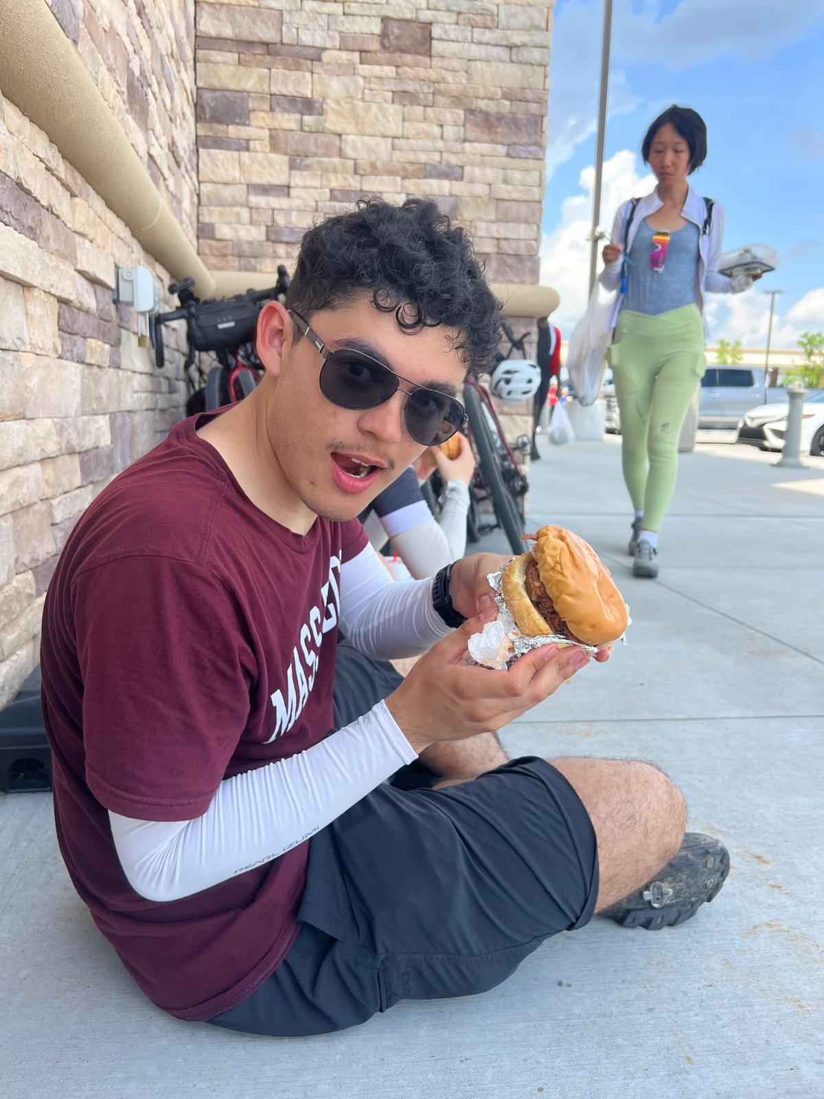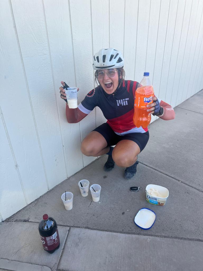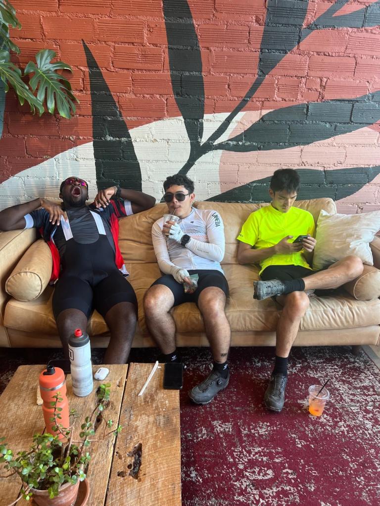 The final rest stop was after a long climb, so I was expecting people to be more tired than they were. Everyone was doing great though (yay team). Tian’s front shifter wasn’t working so Ramona helped fix it 🐐 . Ramona also excitedly informed me that a magical tailwind appeared at mile 85.8, only to disappear a fraction of a mile later. Ishaq consumed Sprite, per usual, while Greta consumed stolen apple sauce, a first.