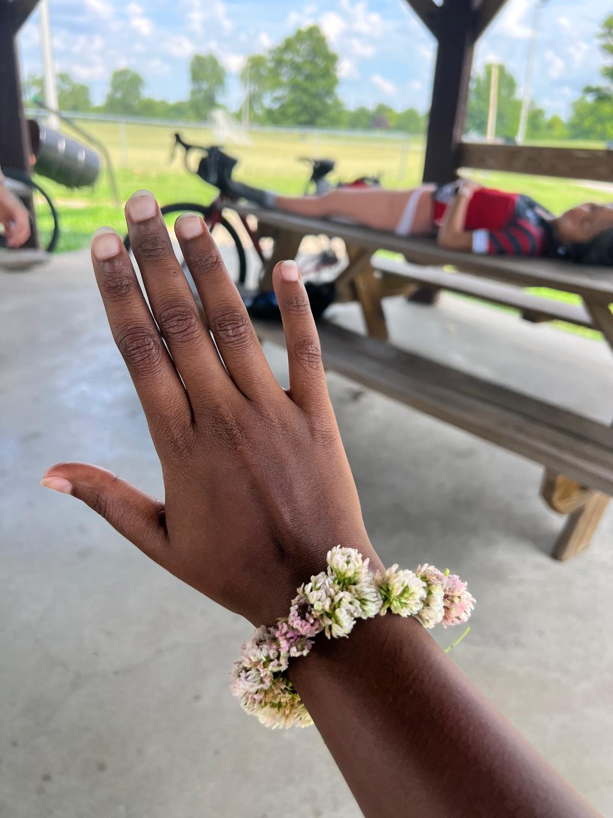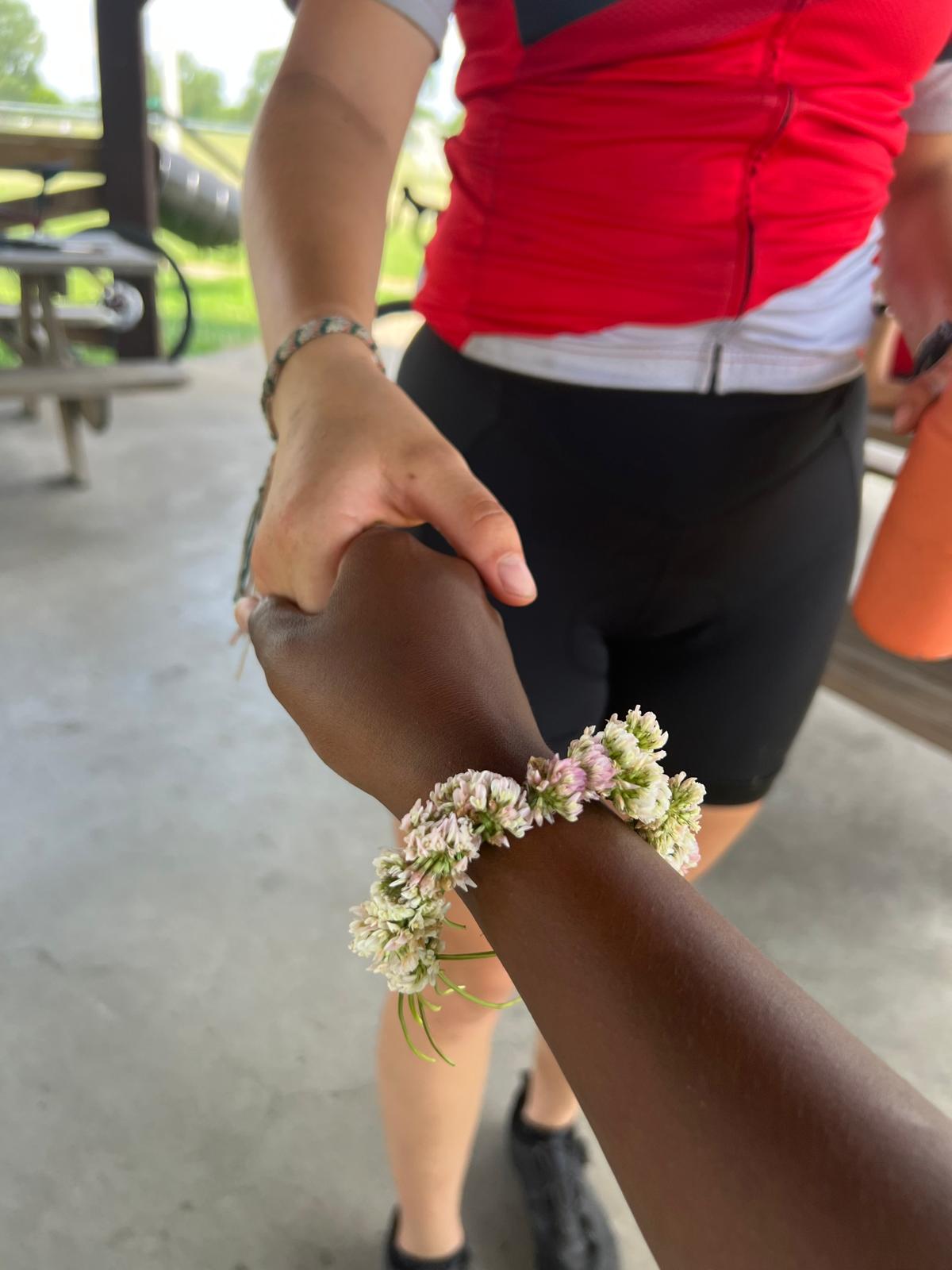 While I’m eating a delicious avocado-hummus-mayo-provolone-turkey sandwich, Greta comes up to me with a present. I’m afraid it’s a pile of mud, but she hands me a beautiful flower bracelet she made while rolling around in the grass. I’m so honored I immediately start taking multiple photos. But these photos aren’t good enough. They need to be more… heavenly. We enlist Charles and he takes a fire photo.