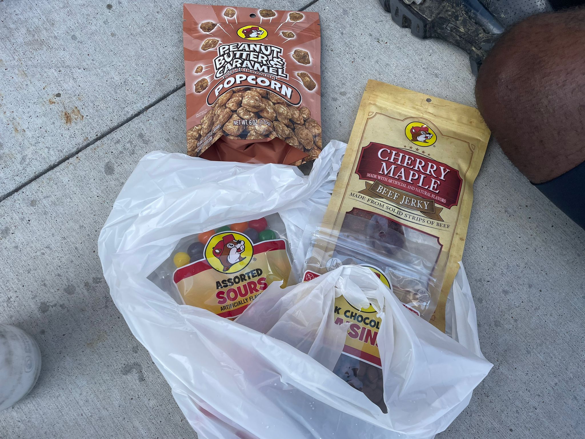 Ishaq recaps his Buc-ee’s haul (“I went in and just went full consumer mode”) before I go in for a second time to buy a round of treats for myself. I wind up buying fresh glazed nuts, cherry maple jerky, assorted sours, peanut butter and caramel popcorn with cinnamon, and milk chocolate covered raisins 😋.