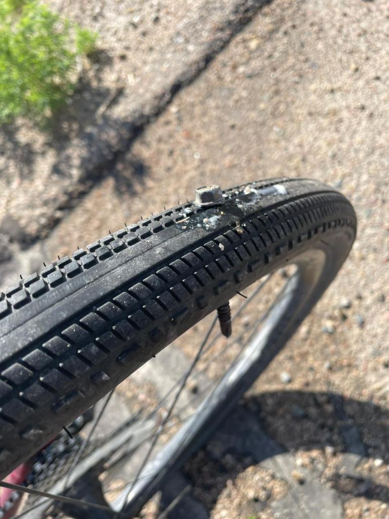 Greta had called Ramona, the gear expert, to ask for her expert advice on Charles’ screw-in-tire situation. Ramona agrees that Tian should pick Charles up and go to a parking lot where he can attempt to patch up the hole with a plug kit. Ramona begs Tian to let us know where they pull over so she can spectate (nerd). Tian unfortunately opts for a grocery store we had already passed to kill two birds with one stone, so Ramona and I continue pedaling to rest stop 1.