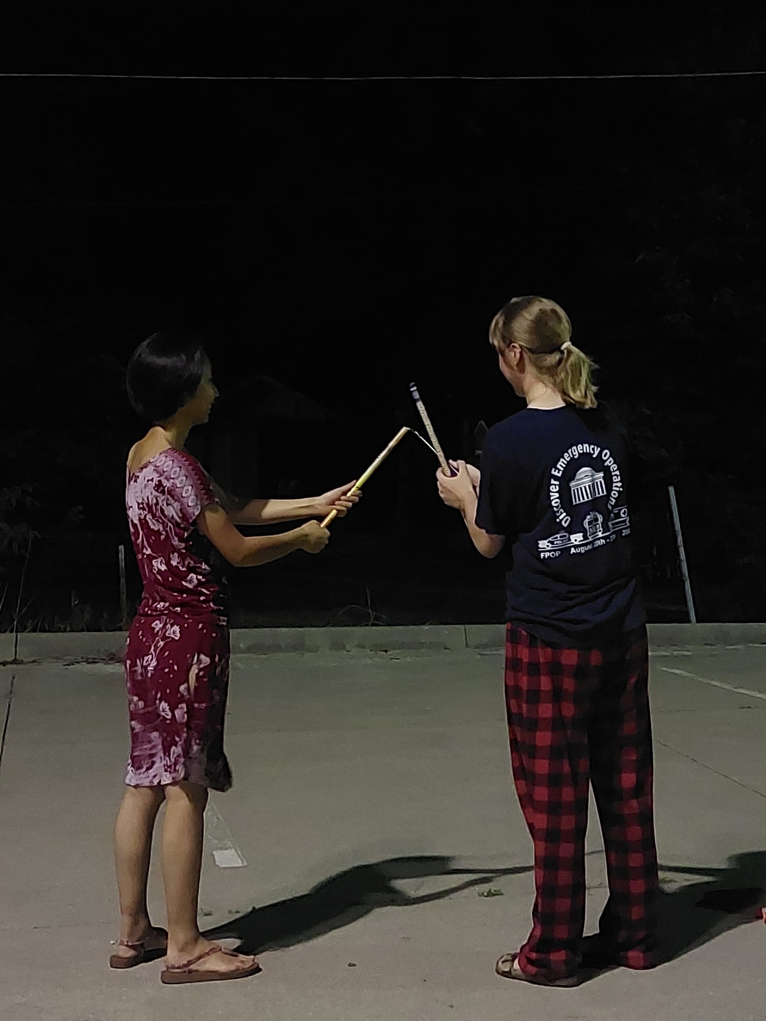 After an intermission of washing dishes, air hockey, and ping pong, the Spokies started setting off firecrackers, sparklers, smoke balls, and Roman candles. Ishaq taunted Greta with a Roman candle which scared Greta enough to run. She fell after slipping on some fine gravel but luckily, she was alright. Clint Lawler (Greta’s Dad) will not be happy with Ishaq after reading this blog. Charles had a (brilliant?) idea to tape a crayon smoke bomb to his bike. He biked around the Didde Center parking lot while his bike farted.