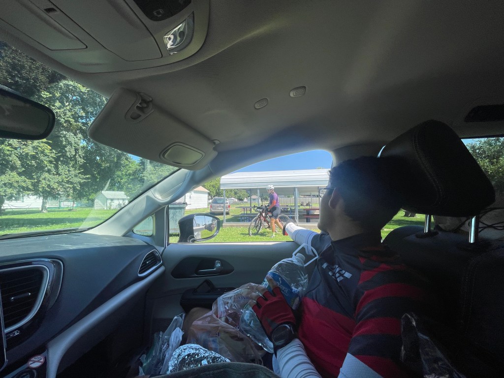The final rest stop was after a long climb, so I was expecting people to be more tired than they were. Everyone was doing great though (yay team). Tian’s front shifter wasn’t working so Ramona helped fix it 🐐 . Ramona also excitedly informed me that a magical tailwind appeared at mile 85.8, only to disappear a fraction of a mile later. Ishaq consumed Sprite, per usual, while Greta consumed stolen apple sauce, a first.