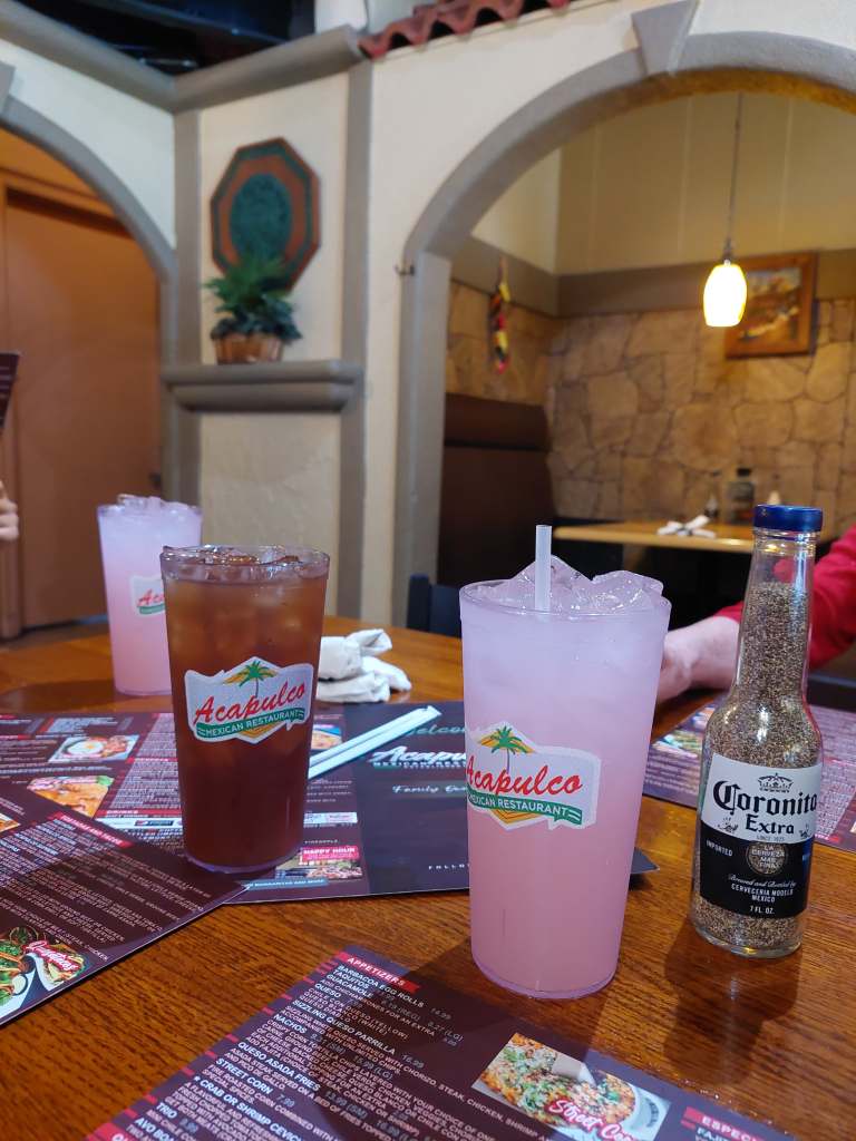 Acapulco!Pink lemonade, not sweet iced tea and pepper in a funny bottle.food!Ruth transfering tea from one glass to anotherNo it’s not the same tea, yes both teas at this point were hers. Yes, she did later realise she could just pour it.