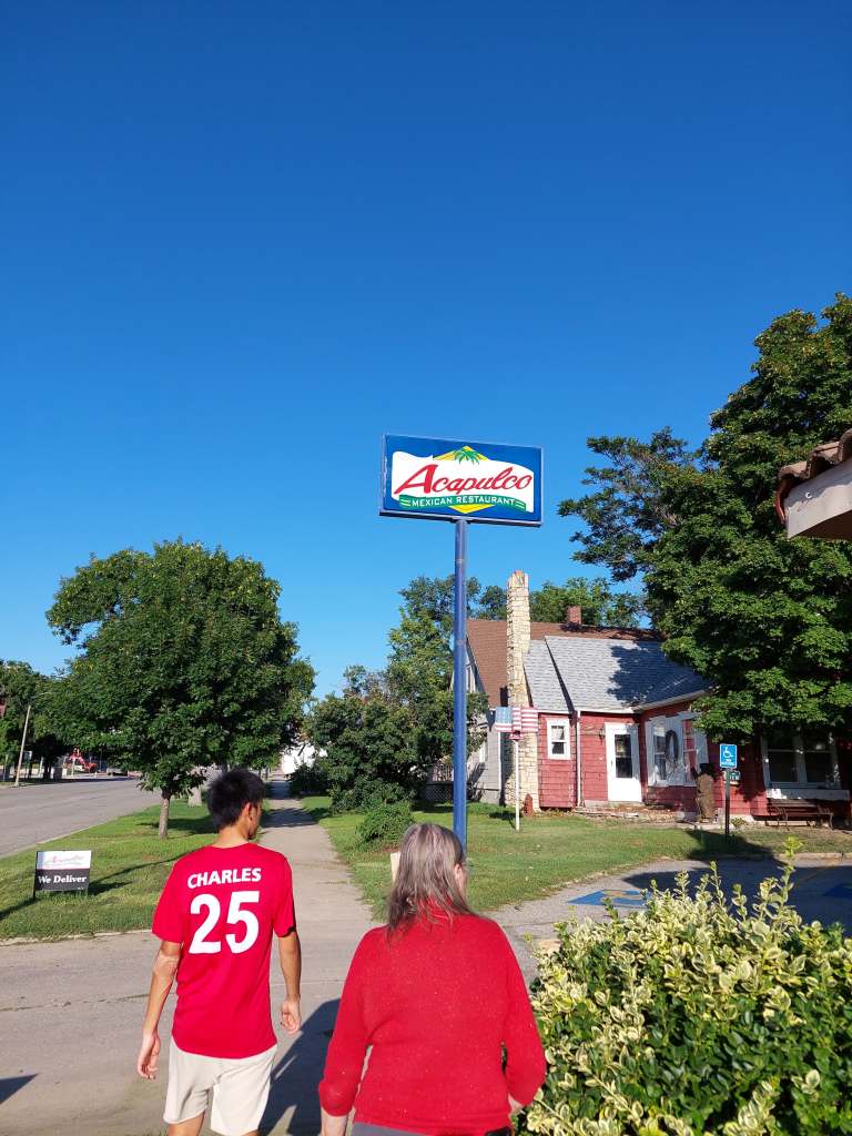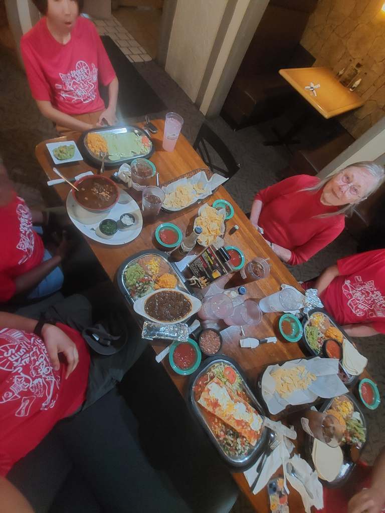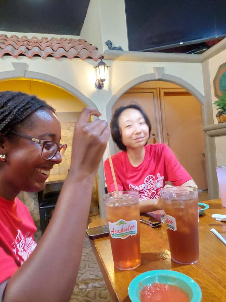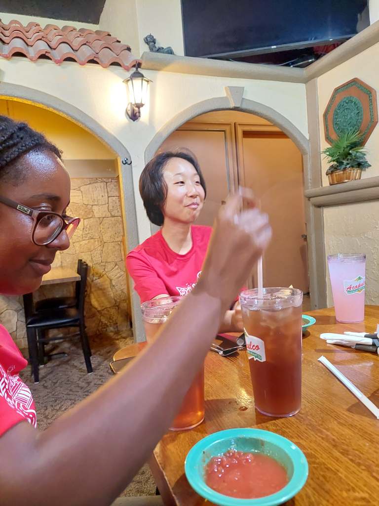 To top it off, our lovely host Janet took us to dinner at a mexican place not even a block away from their home. It was great! I got to try barbacoa and pink lemonade (that was really pink!), Ruth got ramen, which was interesting and did some shenanigans to make her sweet iced tea the right sweetness. Sarah got a huge burrito. I think my braincells at that point were running around without aim, so I got lots of laughs. It was awesome! Thanks Janet and Orvin!