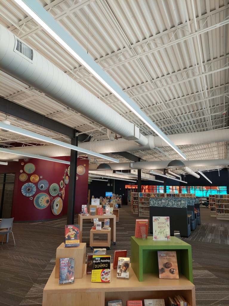 Library!The nicely coloured windows lead to the children’s section. (There is also teen section of course, and plenty of computers.)